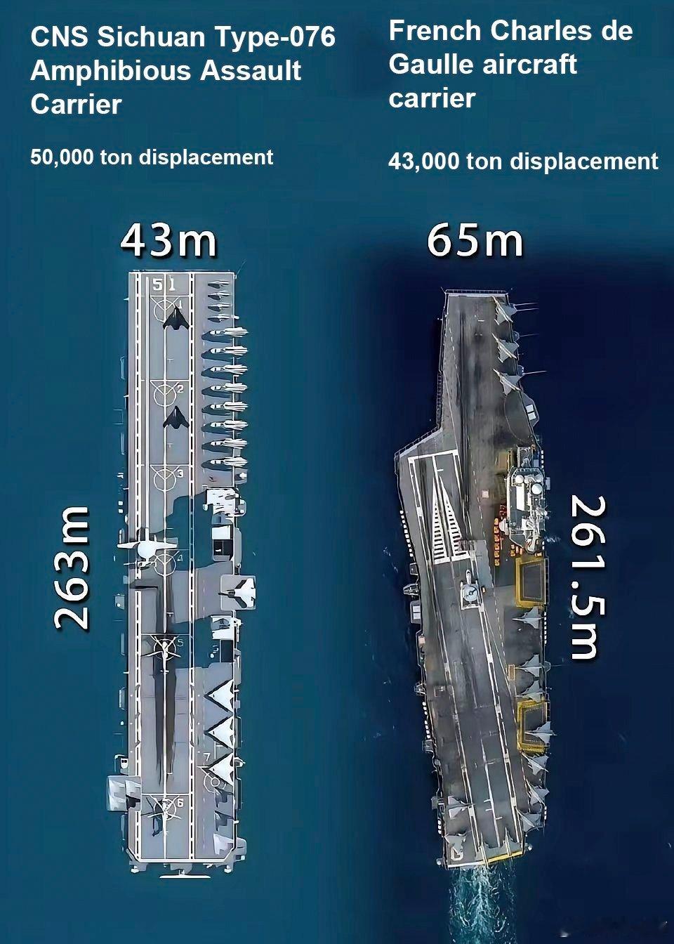 冷知识,076的长度和排水量都要比法国戴高乐航母大戴高乐航母因为实在太小,所以不得不设计了夸张的外飘甲板容纳舰载机如果今后076能够弹射歼35,戴高乐航母真不见得是076的对手烽火问鼎计划