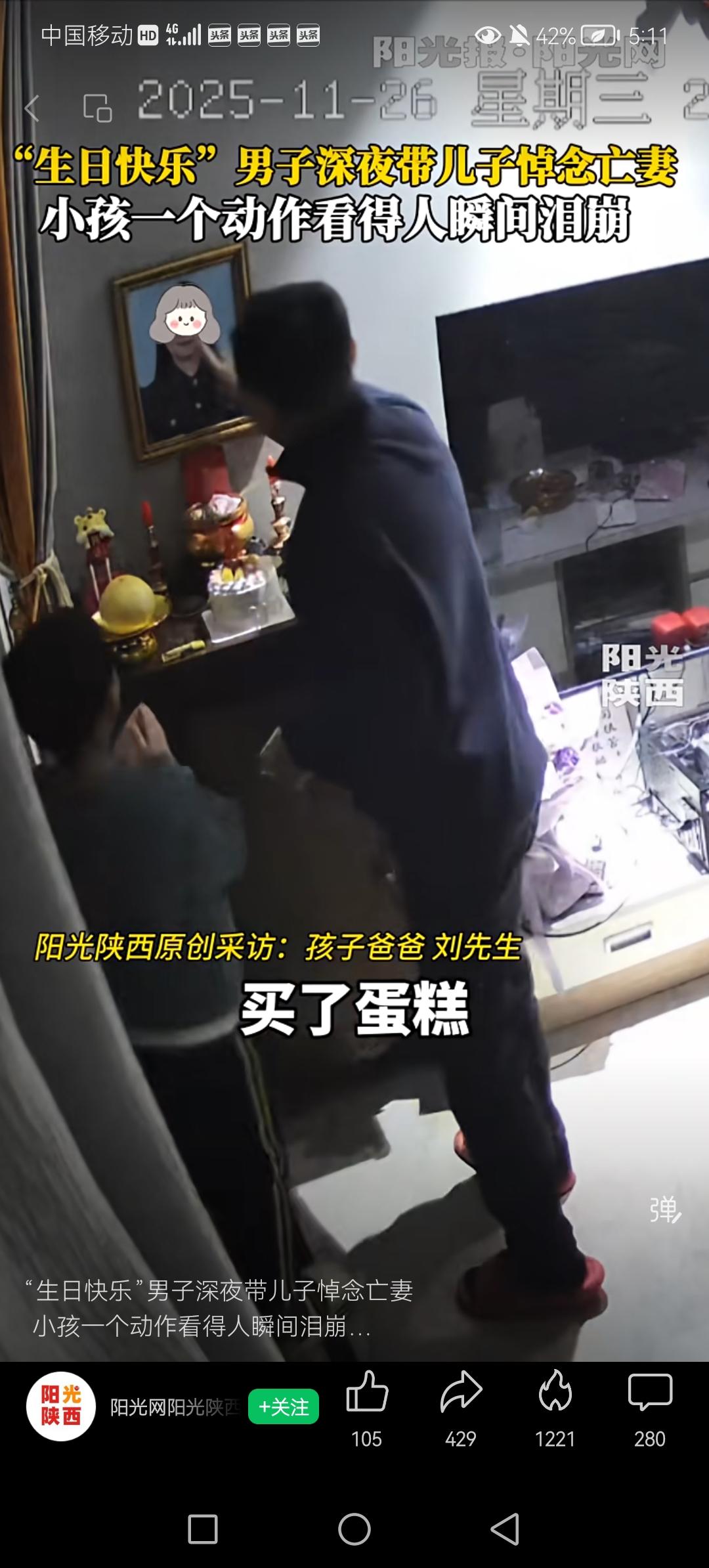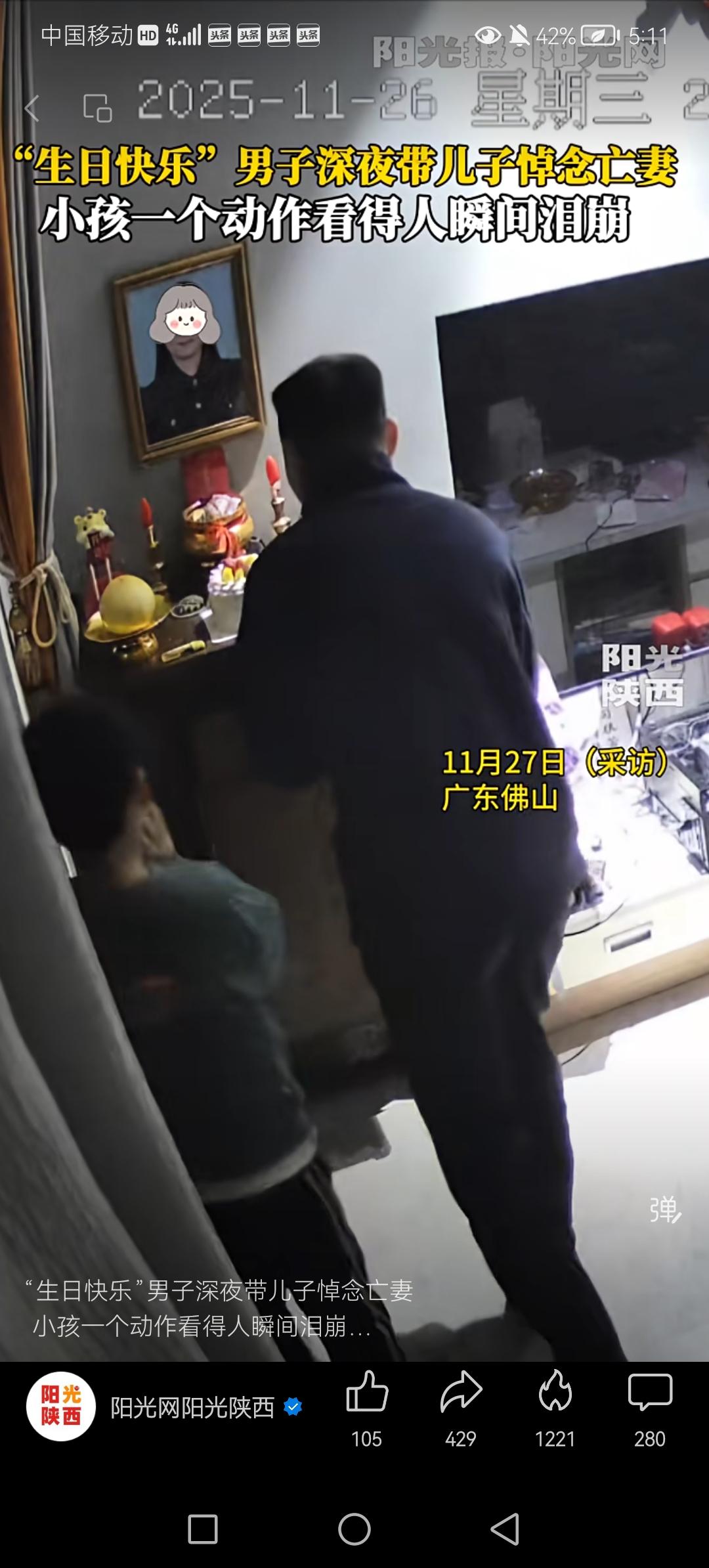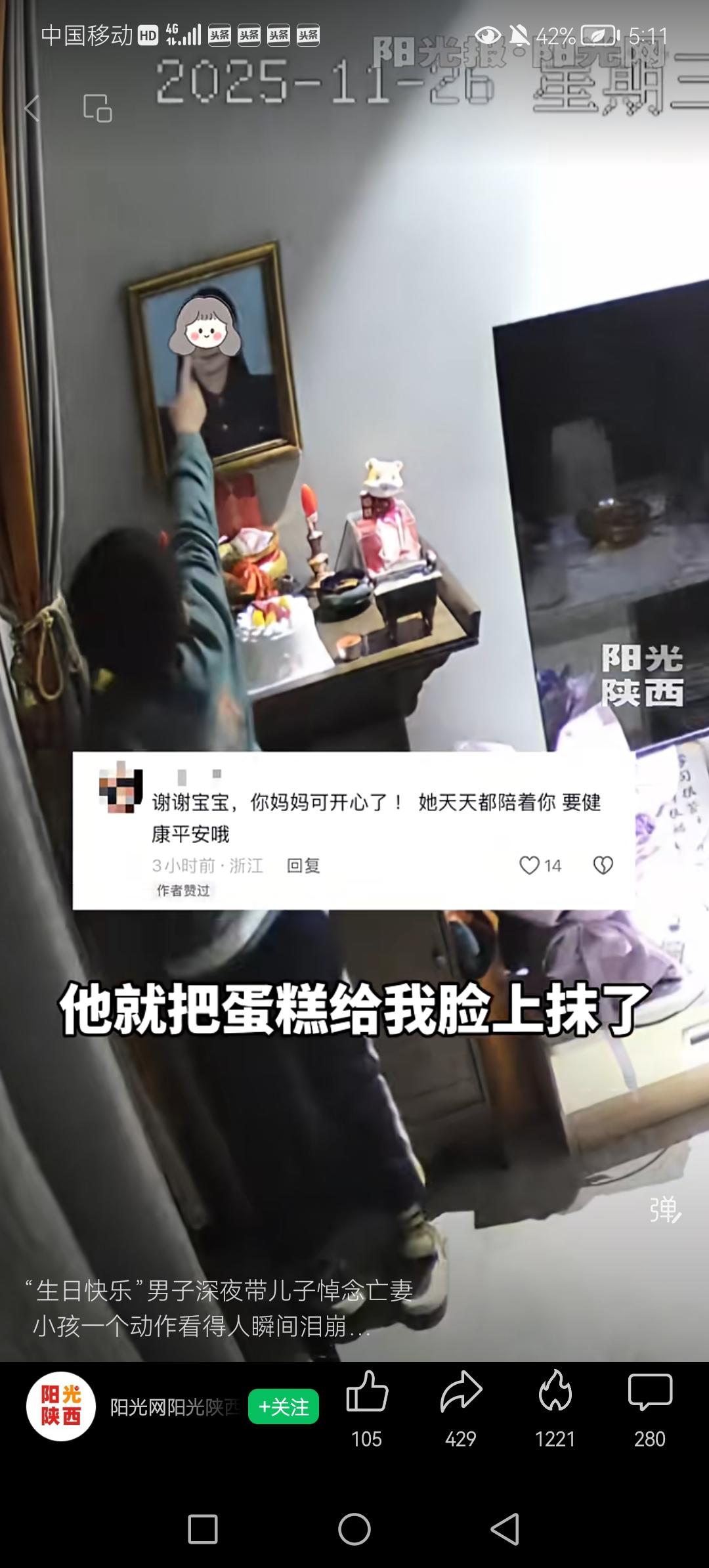 “妈妈,生日快乐!”11月27日,广东佛山一男子带儿子一同为“亡妻”庆祝生日,儿子一个动作,爸爸瞬间泪崩! 今天是妈妈的生日,爸爸带儿子买了一个小蛋糕放在妈妈的遗像前,一家人像上次一样欢快地拍节奏唱着生日快乐歌! 唱完生日歌,丈夫像逗小孩一样往妻子脸上摸了一块奶油,轻声告诉她:“生日快乐!” 妻子照片上那浅浅的微笑似乎就在昨天,像个倍受宠溺的小公主。 儿子也学着爸爸的样子,努力的踮起脚,将手指上的奶油抹到妈妈的另一边脸上,又抹了一块奶油到爸爸脸上,儿子这一动作让爸爸瞬间泪崩。 对于孩子来说,可能并不知道死亡究竟意味着什么。孩子可能只是觉得,妈妈去了一个很远的地方,总有一天会再见到妈妈的。 而对于男人来说,生死之间便是永不再见,孩子作为生命的延续,将使这份亲情与爱长存! 催泪