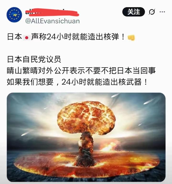 日本自民党议员晴山繁晴说,不要不把日本当回事,只要日本愿意,24小时就能制造出核武器, 不知道这位议员想吓唬谁,我只知道,东风快递只要十几分钟,就可以把日本想要的东西送过去, 无核国家恐吓有核国家,这种事只有日本能干吧, 对日本来说,大概唯一能聊以自慰的是,挨过两颗原子弹的日本,在核爆炸的自救,核辐射以及战伤处理方面,确实拥有丰富的经验。