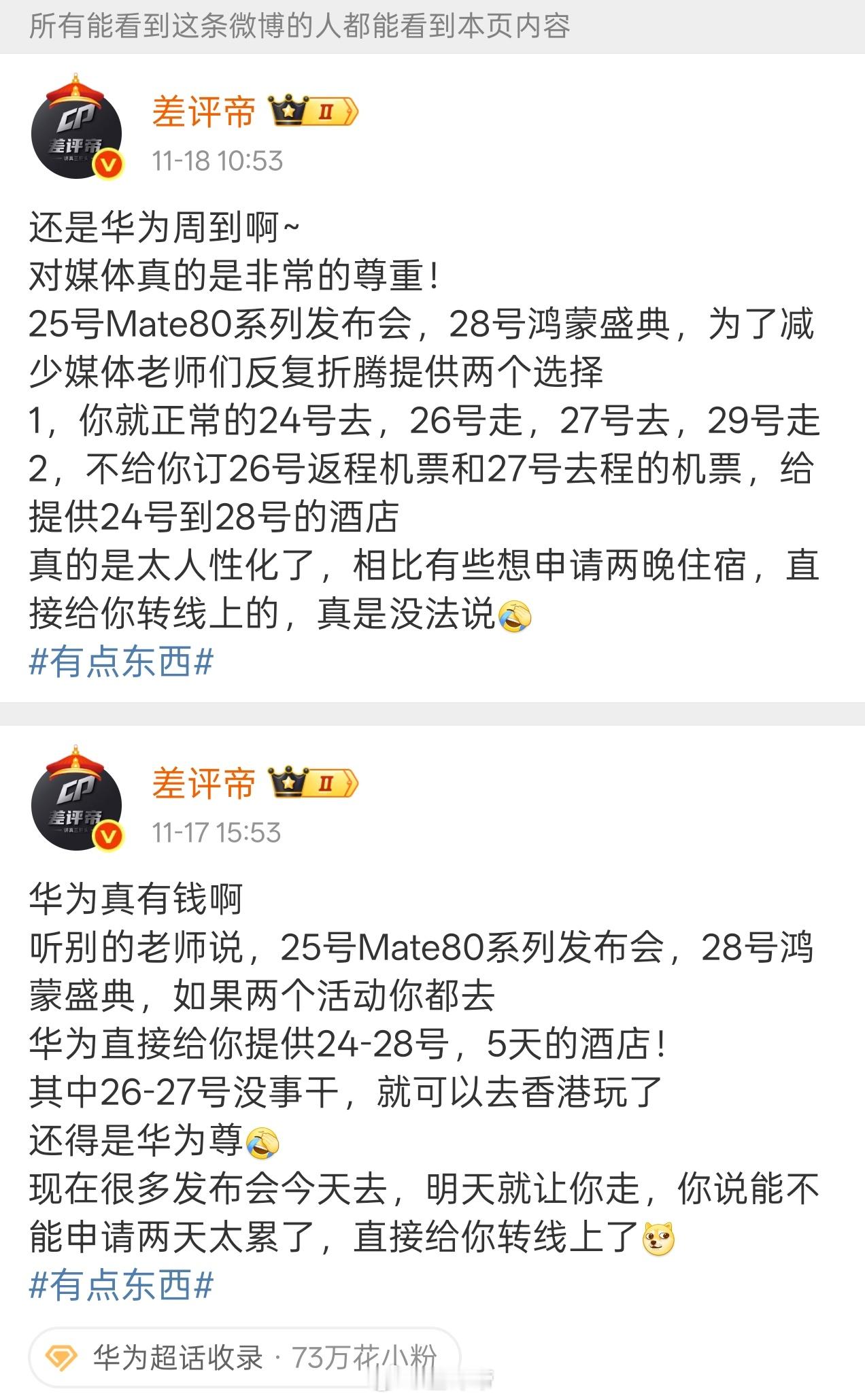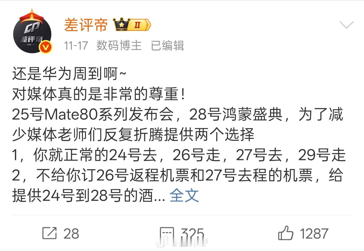 好~华为Mate80系列发布会也结束了现在再说这个事应该不会被扣上蹭流量的帽子吧?事情呢是十七号我发了一个关于华为Mate 80系列发布会的微博,没想到引起了广泛的讨论事情的起因是在发这个微博之前,有其他活动的邀约,提供的是一晚的住宿但是因为有临近的活动邀请,当时向邀请方提出了能否申请两晚住宿的需求本以为答案是能或者不能万万没想到答复是:这个样子的话,给老师您转线上参加吧当时呢确实感觉有点伤心,所以在参加另外一个活动的路上,把这个事情跟另外一个老师讲了讲这个老师就讲到了华为Mate 80系列的发布会。他讲到25号是华为Mate 80系列的发布会,可以24号去。然后28号是华为的鸿蒙盛典。如果两个活动你都参加的话,那么华为可以给你提供24号到28号的酒店,说让人感觉很尊贵当时呢,比较之下呢,我也是觉得真的是非常的尊,所以就发了这么一个微博(图一)第二天华为的公关公司的工作人员找到了我,说这个微博带来了不太好的舆论,希望我能处理一下在经过简单的沟通之后,我第一时间就对原微博进行了编辑,并精选了评论区(图2)我之所以没有删除这条微博的原因是图7、图8还有不少类似的言论,我就不一一列举了总结一下,就说我经常带华为的节奏,是华为的黑子,说我只会吹小米,踩华为那我第一时间让他们拿出截图、拿出证据,他们又拿不出来,也不做任何回复,但是就硬要给我扣上这个帽子那么好,我要拿出证据了那么请看图四、图五,这是黑华为吗?你们也可以去我主页搜索华为两个字,可以看我所有有关于华为的微博,基本上都是积极正向的评价再看图六请问说我只会吹小米,踩华为的,请问这是不是可以理解成,拉踩小米呢?小米的发布会都是有邀请我的,我还经常玩他们的梗,他们从来没有找过我那么只是发了一个关于华为发布会的一个真实的信息,就被某些人扣上拉踩的帽子,这合理吗?继续看图九23年的时候,我还参加过华为的花粉年会呢,怎么华为都不觉得我是黑子,到你们嘴里我就是呢?其实到这里就很清楚了这些人根本就不是华为的粉丝,他们是一群串子,他们每天在做的事情就是不断地去攻击,像我这种从未接过华为商单,从未参加过华为发布会的比较中立的博主从而因此让这类博主对华为产生厌恶的情绪不管是在微博也好,还是其他平台也好,这类的人特别的多这也导致很多人其实没有用过华为的产品,但是非常讨厌华为这个企业的原因,不是因为华为的问题,而是这群串子在不断地给华为抹黑这就是他们的工作让每一个原本对华为比较客观的博主,变成厌恶华为,甚至不断产出华为负面消息的博主,他们的KPI就达成了不过到我这里,你们的如意算盘打空了实事求是,独立思考,明辨是非这12个字,我一直记着呢