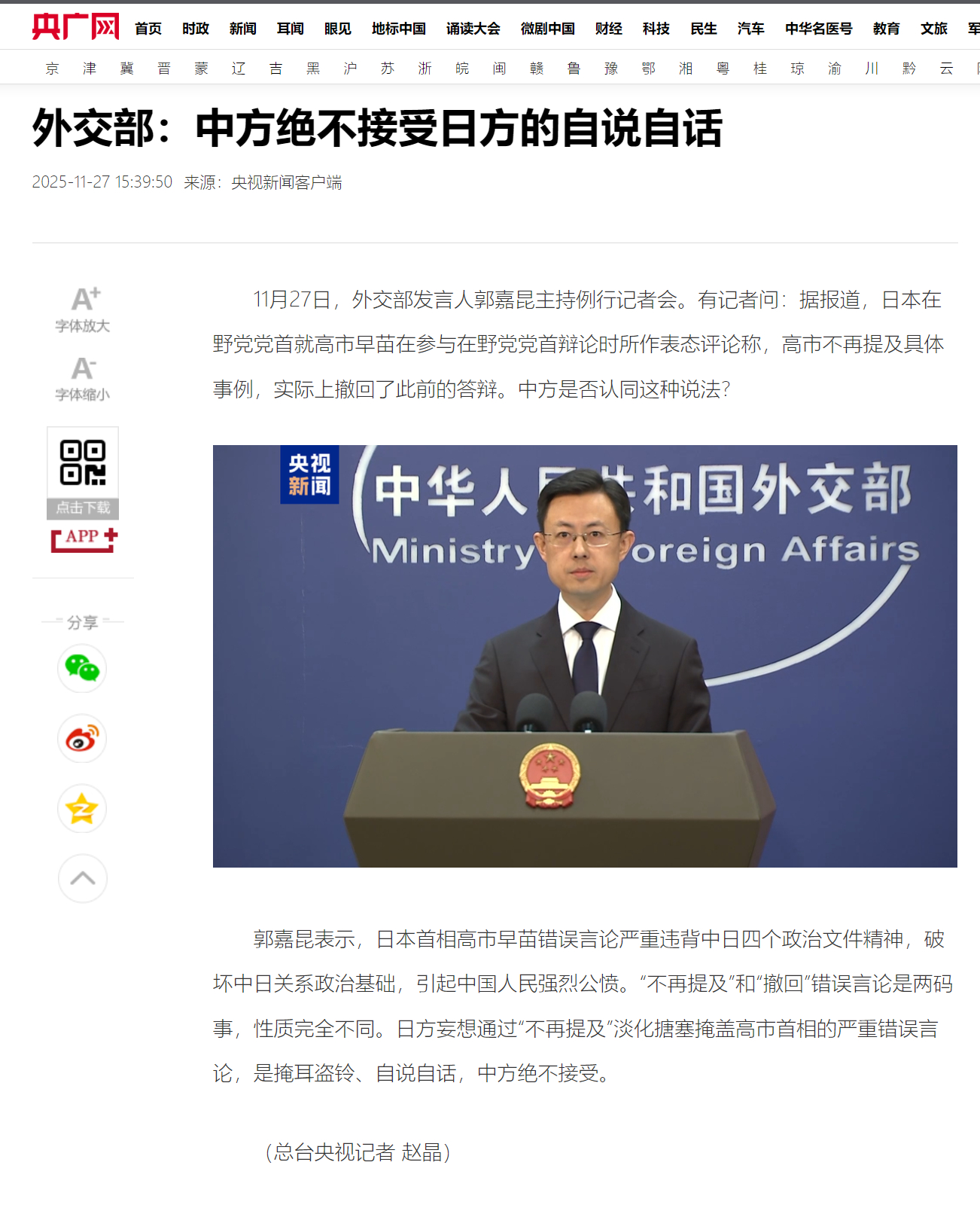 🔻外交部:中方绝不接受日方的自说自话。高市再发涉台谬论高市被质问日中关系恶化该如何负责热点现场
