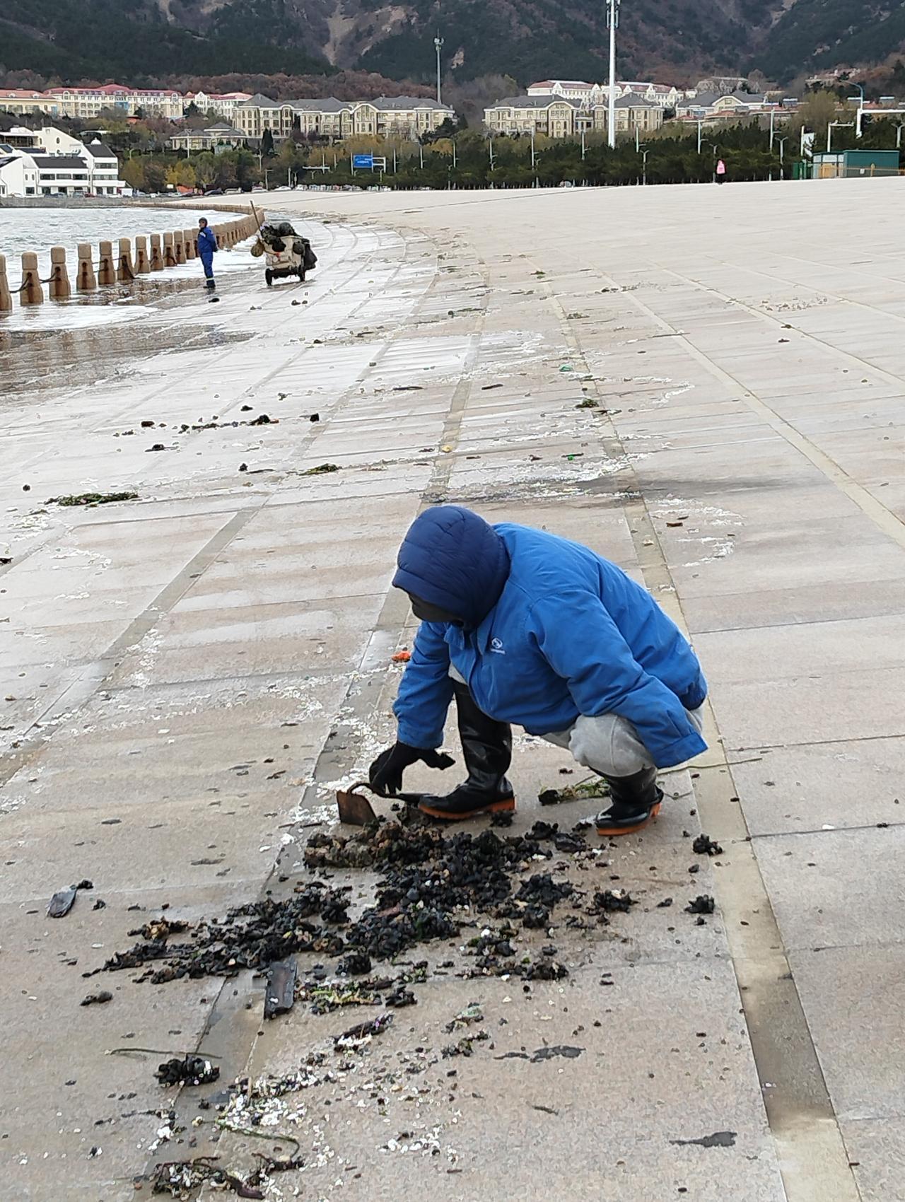 今天下午上西口码头,一个人的影子也没有见到,狂风呼呼咆哮着,惹得桅杆上的红旗嘶嘶怒号。 我索性迎着北风,沿着西海岸向西南逛起来,欣赏海上夕阳西下的美景。 “在苍茫的大海上,狂风卷着乌云,阳光从云隙间射出万丈光芒,有什么能比的过大海的波澜壮阔。” 海鸥在暴风中也毫无畏惧,追逐着浪尖勇敢的翱翔。 有一个似乎左臂断掉的女子,正用小锄头费劲的刨,被风卷在岸边的一点点野海蛎子。一个老伯穿着雨衣雨靴子,用长铁勾子捡被风冲到岸边的塑料泡子。一个塑料泡子可以卖一元钱,老伯捡到六个了,老百姓捡漏也不容易呀。