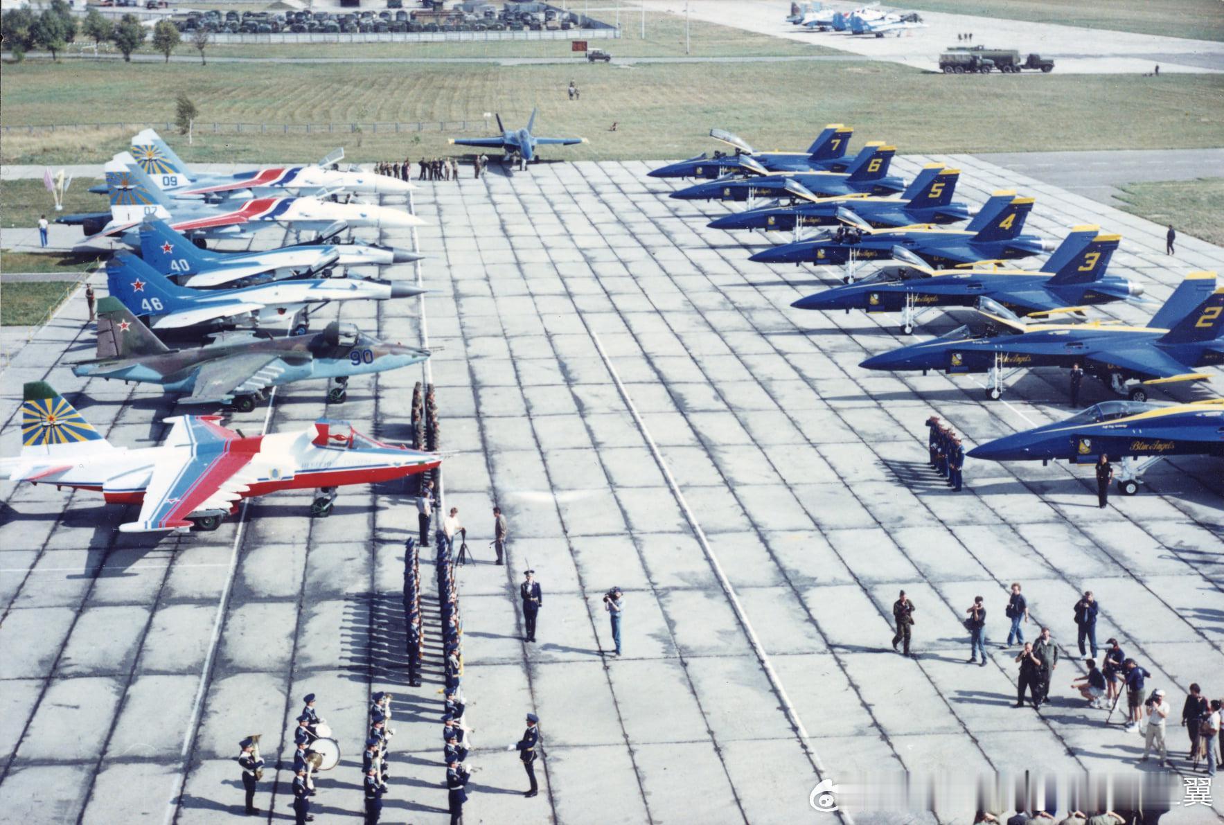 1992年9月,蓝天使飞行表演队访问库宾卡空军基地,F/A-18大黄蜂战斗机与俄罗斯勇士、雨燕和天空骠骑兵特技飞行表演队的苏-27、米格-29和苏-25战斗机面对面。[1767x1191]