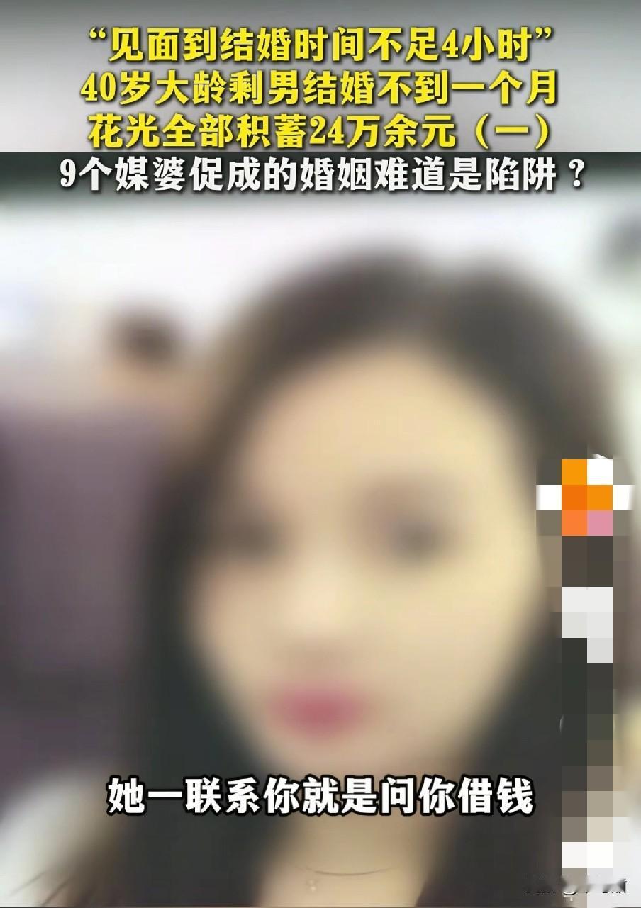 一个40岁大龄青年,经9个媒婆介绍了一个漂亮女子。对,没听错,9个媒婆起哄下,相亲当天仅交流了10来分钟就决定闪婚了,还以为这是爱情的味道,可没想到陷入了尴尬的境地。 近日湖南衡阳,一男子貌似被做了局,与他的相亲对象仅认识了4个小时后,就闪婚了,本以为幸福来得太突然,可没想到,这女的连碰都不给他碰一下,抱也不行。 还以为女方很矜持,想着结婚证也领了,睡到一起也是迟早的事,可没想到这女的以结婚买东西为由,不停的找他要钱,几天时间就花光了男子24万存款,眼看没钱了,就催他去广东打工养她。 钱也花的差不多了,人都还没亲一下,就催着叫他走了,这男子才觉得不对劲,觉得自己被这群媒婆和这女的做局骗了,撵着他走是不是想趁机跑了。 男子一着急又找到女方家里,结果更离谱的是,找到女子的爸爸,对方竟然说不认识他眼前的“女婿”,而且这个家的位置,是租的,不是她真实的家庭地址,后来被女方的姐姐告知,这女的在外面欠了很多赌债,把家里弄的一团乱,家里人根本不打算认她。 这时候这男子才知道,自己果然被这群人坑了。等终于多方联系到这女的,结果还被她倒打一耙,说既然他把这件事弄到了网上,被大家人尽皆知,那就永不相见吧。 现在真怀疑,当时那几个媒婆是不是这女的债主哦,合起来一起欺骗单身大龄青年,就图他们想快结婚,骗钱找借口再离婚,所以说,结婚真的要擦亮眼睛啊。 (图片来自网络视频)