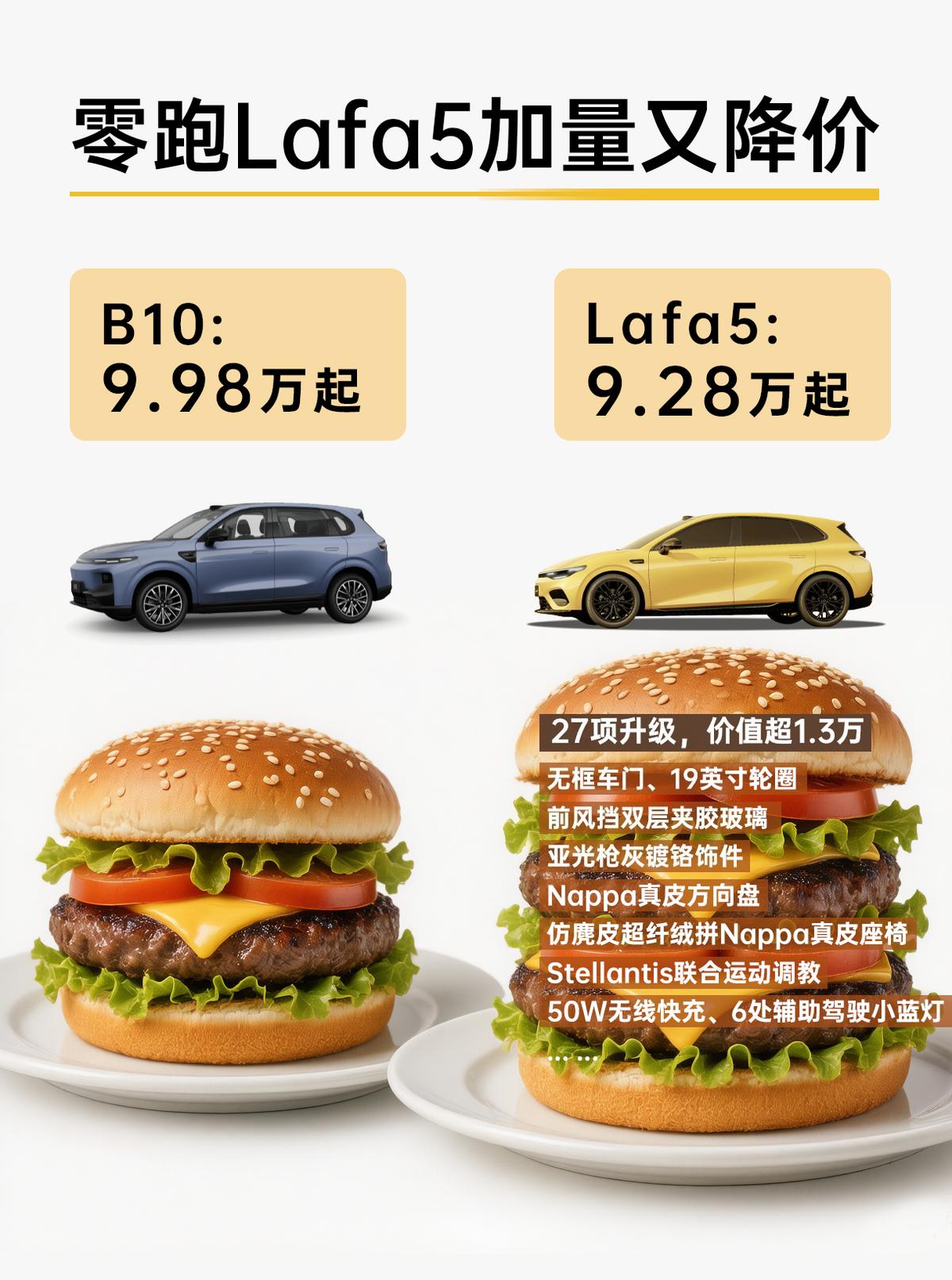 人生第一台Dream Car已就位,零跑Lafa5 9.28万开售 售价9.28万-11.68万元,零跑Lafa5正式开售,并给到限时享24,900元上市礼遇+四项终身免费质保,以及特殊退坡补贴等诸多权益。 很多人都说Lafa5个性得不像零跑的车,但事实就是,Lafa5是零跑新十年的开局之作。 在已经深入人心的“品价比标杆”之外,Lafa5将承接零跑“个性化”的战略,凭借个性化设计和运动化调校,Lafa5不仅在同价位段没有竞品,更是15万内唯一的运动轿跑,必然是年轻用户的首选。 颜值方面,零跑Lafa5不仅拥有宽体低趴的运动造型,还有无框车门、19英寸掠翼运动轮毂,以及6处辅助驾驶小蓝灯。内饰方面,大面积仿麂皮超纤维用料、前排双座椅通风/加热、真皮方向盘的加持,带来更豪华更运动的氛围。此外,Lafa5还有Stellantis联合调校的运动底盘带来的硬核驾控,以及8295P+8650双芯+激光雷达的顶级AI智能。 如今,零跑月销连续创新高,提前达成50万台年度目标,并且连续季度盈利,在如此稳定强势的状态下,零跑Lafa5顺势而来,这意味着零跑品牌年轻化与全球化有了双重引擎,明年百万销量也有了全新动力。