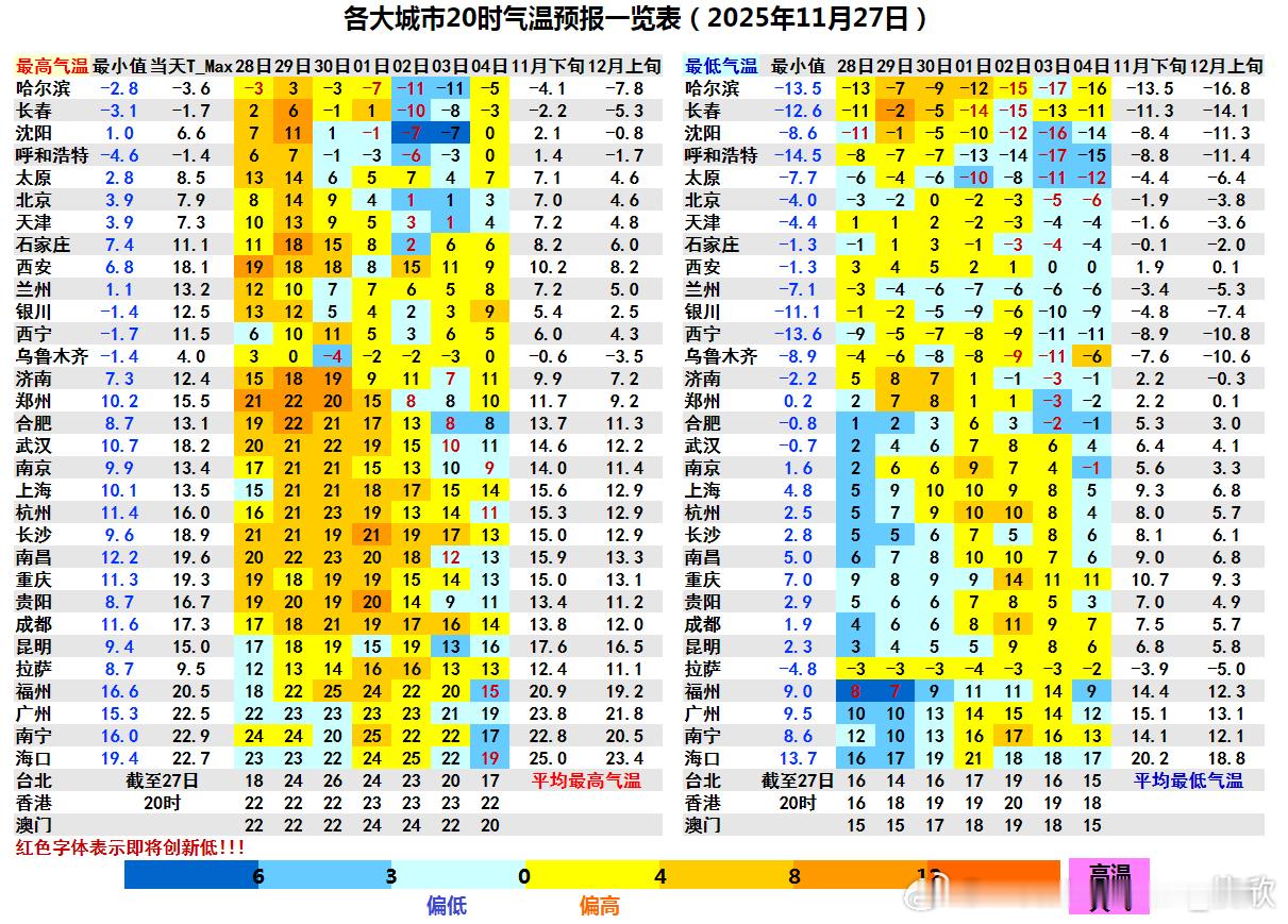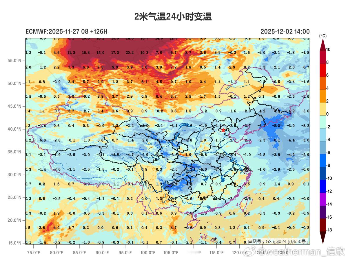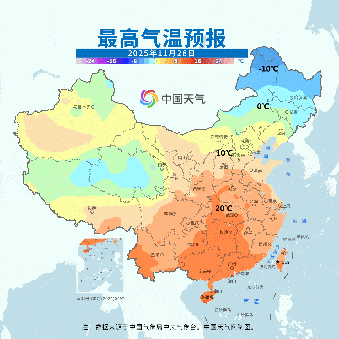 【气温——东北起伏最大】今天东北降温之后,明天又迎来明显回升。沈阳今天14时为零下2℃,明天下午预计最高7℃。11月29日东北气温将达到近期高点,之后在冷空气接连影响下,一路下降。对比11月29日和12月2日最高气温,沈阳降18℃、长春降16℃、哈尔滨降14℃。从明显偏暖变明显偏冷,并创立冬后气温新低。短期内,冷空气对长城以南地区的影响相对弱,未来2天最高气温20℃线会不断北扩,挺进到河南。郑州29日最高可达22℃,如果兑现,将打破当地11月下旬最高气温纪录(21.7℃,2010-11-29)。不过12月初因为冷空气影响,气温也会大幅下降,12月2日郑州最高降至8℃,相比11月29日高点,降幅有14℃。总体来看,30日的冷空气重点影响内蒙古和东北。12月初的冷空气会波及到中东部的大部地区。南方在12月2-3日还有阴雨,最高气温也会有明显的下降。比如武汉11月30日最高22℃、12月3日最高10℃。南京11月30日最高21℃、12月3日最高10℃。杭州11月30日最高23℃、12月2日最高13℃。