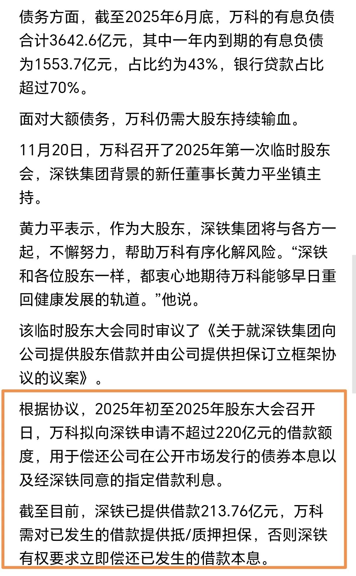 深铁集团给万科无限输血续命的大戏,估计快要结束了。 万科目前已经向深铁集团借了