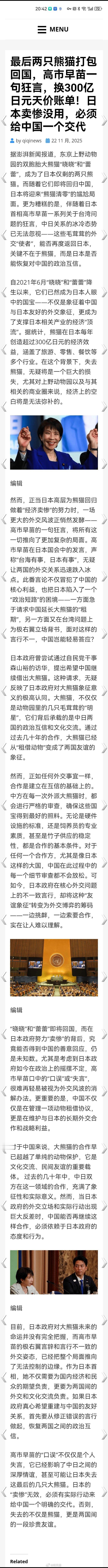 最后两只熊猫打包回国,高市早苗一句狂言,换300亿日元天价账单!日本卖惨没用,必须给中国一个交代 !高市再发涉台谬论海外新鲜事何天恩