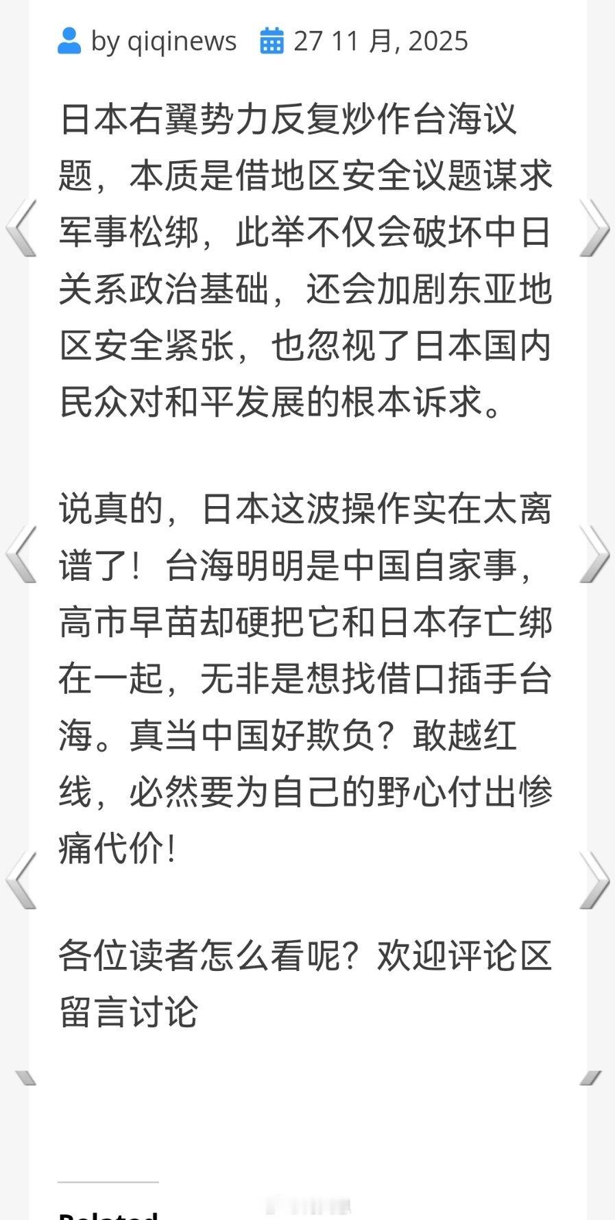 日媒11月25日曝出重磅消息,日本内阁会议当天正式批准首相高市早苗的书面回复:高市早苗在回复中明确表示,日本当局并未改变此前的涉台态度,既无需重新审议相关立场,所使用的表述也与今年7月内阁通过的《对安全保障政策的反映》完全一致。高市再发涉台谬论海外新鲜事何天恩