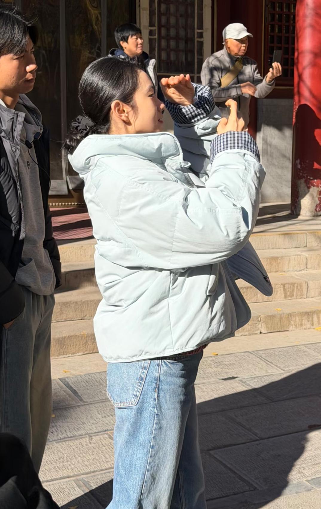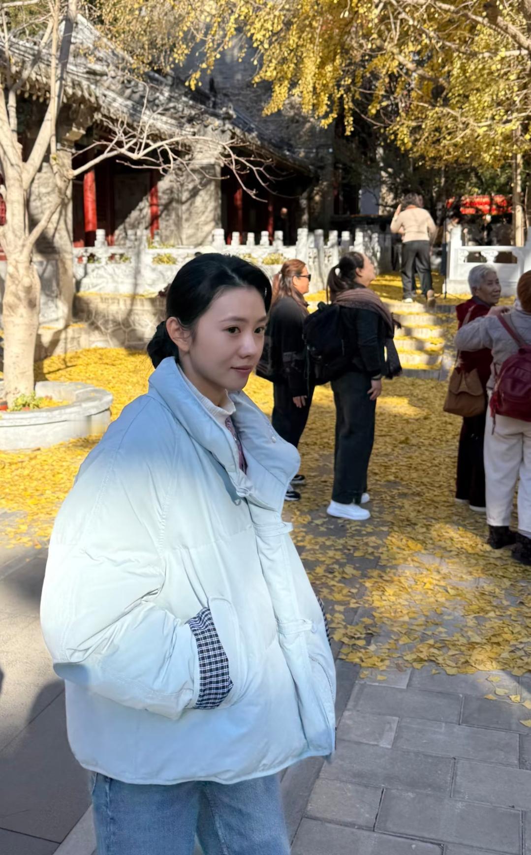 去潭柘寺看银杏,正好撞见刘浩存拍戏!这时候的潭柘寺满地都是黄银杏叶,特好看,她穿个浅蓝的厚外套,往那儿一站,脸小小的,看着是真漂亮,眼睛亮晶晶的特有灵气。 现场看她拍戏,有段流泪的戏,眼泪一下就出来了,情绪看着特真,旁边人都跟着安静下来了。她也没什么架子,休息的时候就站在银杏树下,跟普通小姑娘似的,比屏幕上看着更软乎乎的。 本来是冲银杏来的,结果意外撞见拍戏,这趟潭柘寺没白来,真人好看就算了,演技是真能让人共情。