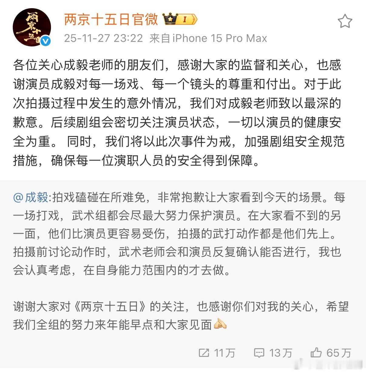 《两京十五日》剧组终于公开对成毅道歉了,承诺将整改威亚团队,期待有措施落地落实,会将艺人生命安全放到第一位,规避安全风险,更期待作品早日和大家见面!