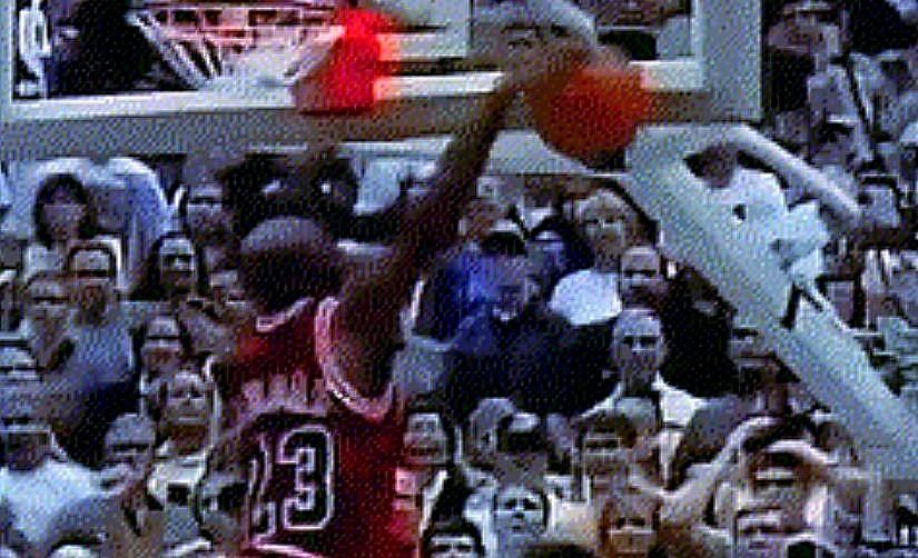 1997年总决赛上,斯托克顿抢断乔丹。 斯托克顿冲过来用力打在乔丹手上完成抢断,