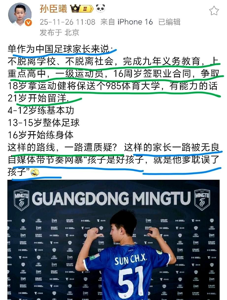 反击正式打响! CC孙臣曦之父孙守东,炮轰无良自媒体,带节奏网暴“孩子是好孩子,就是他爹耽误了孩子”。 孙守东详细列举了他给儿子孙臣曦做的规划:不脱离学校、完成九年义务教育,上重点高中,争取保送到985体育大学。 只要在每个阶段学习时,有靠谱的教练给指导,以后有机会进入职业足球联赛。 别管是国外还是国内。 留洋不一定都有出息,但不留洋一定不利于整体进步!不利于中国足球! 人家自己的孩子有自己培养规划。网上总有些东西咸吃萝卜淡操心 要么就是小孙废了,要么就是小孙的计划很稳妥啊。 去留洋的那些足球小将废了,反正就是二极管。 实际上小孙也好,小将也好,都有可能成功,但人把自己活成二极管,那才真是废了