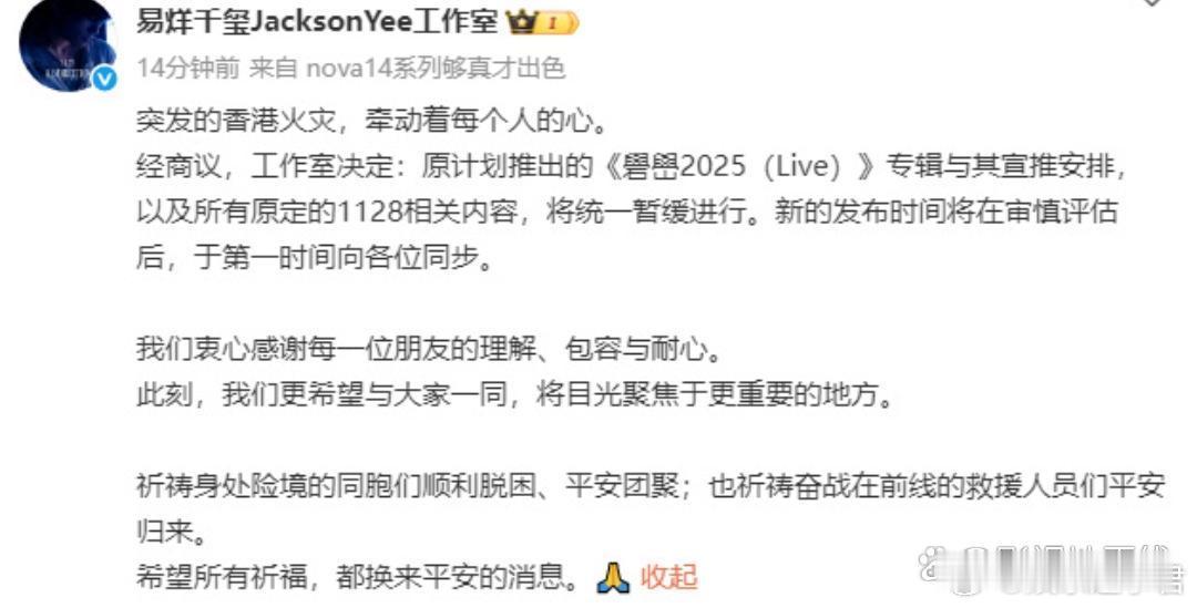 易烊千玺 工作室发文宣布原计划推出的《礐嶨2025(Live)》专辑与其宣推安排以及所有原定的11月28日相关内容,将统一暂缓进行。新的发布时间将在审慎评估后,会于第一时间向外界同步。
