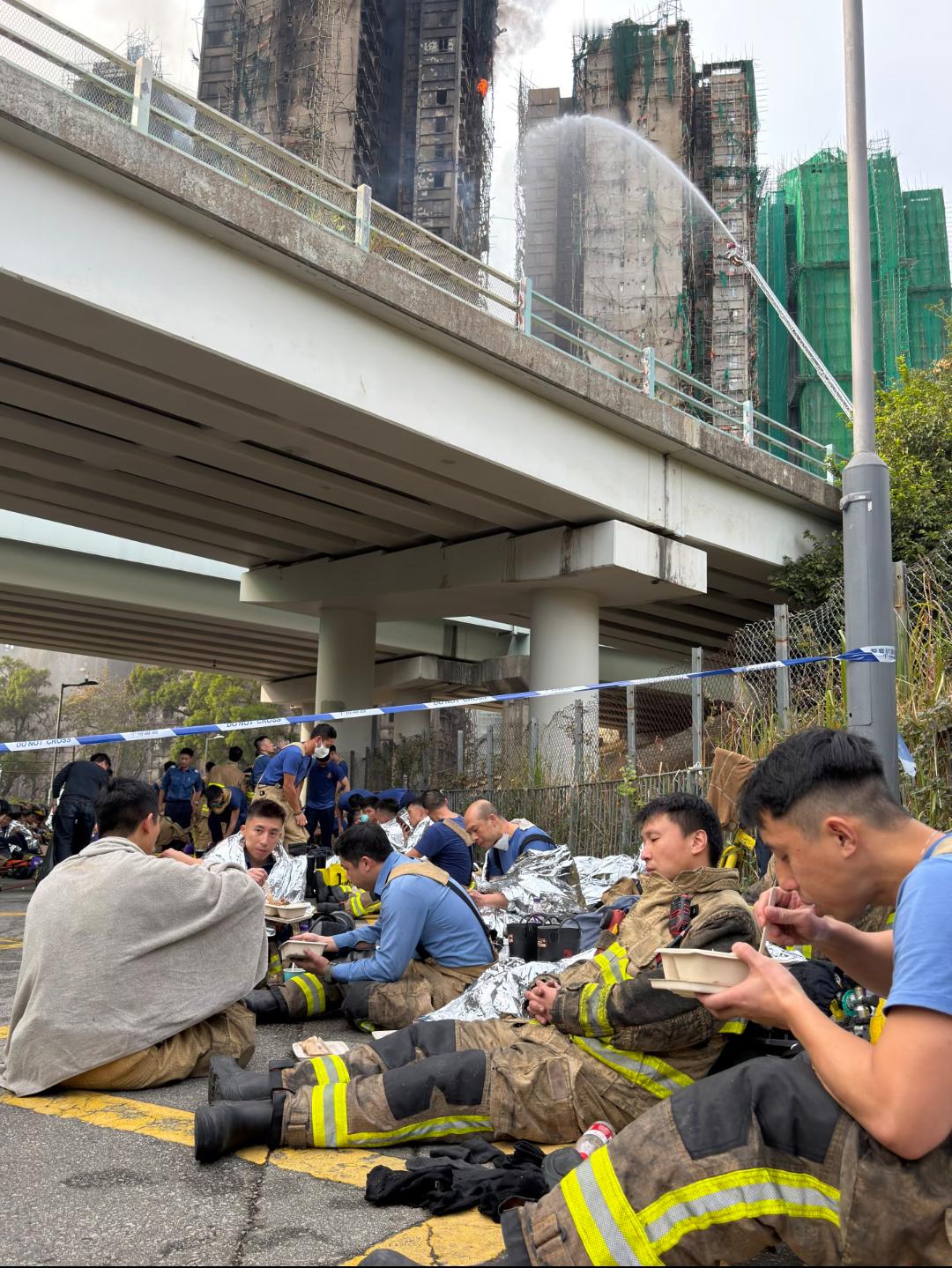 香港火灾已致44人遇难 今早的大埔宏福苑火灾现场,火勢較前一晚減弱,但現場仍有零