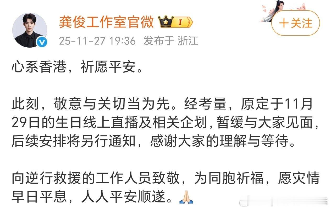 龚俊生日会直播及相关企划延期了,后续安排另行通知,菌菌粉丝一如既往地正能量,愿灾
