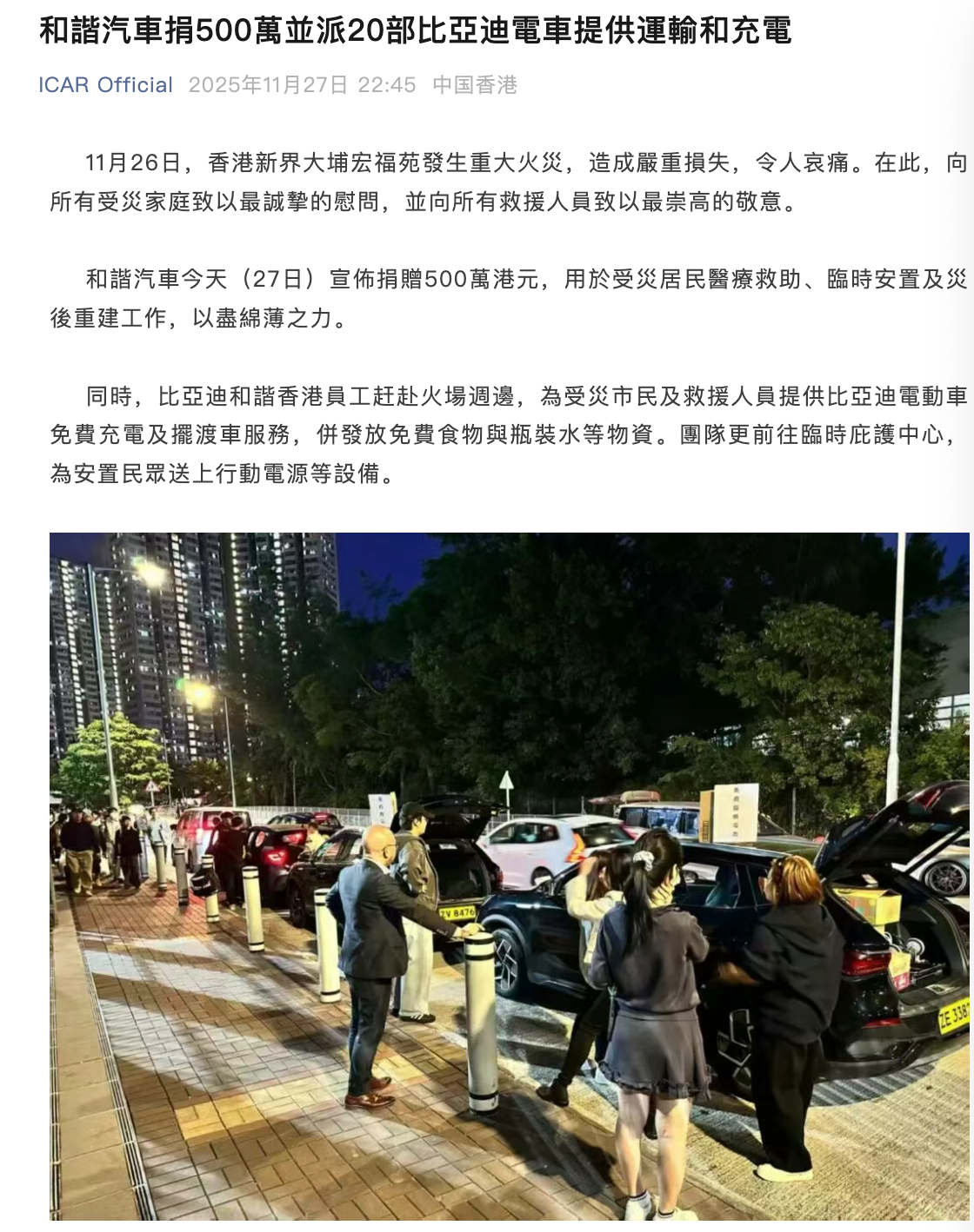 【香港火灾已有75人遇难 ——比亚迪在香港的经销商,出钱出力出车】和谐汽车捐 500 万港元并派 20 部比亚迪电车驰援①捐赠 500 万港元专项用于受灾居民医疗救助、临时安置及灾后重建工作。②和谐汽车联合比亚迪的香港员工第一时间赶赴火场周边及临时庇护中心,开展多项支援服务。③和谐汽车已调配 20 部比亚迪电动车辆,为救援人员、受灾市民提供免费摆渡运输服务及充电支持。团队还向现场人员发放免费食物、瓶装水,并为临时庇护中心的安置民众送上行动电源等急需物资,员工们日夜接力坚守现场提供帮助。多家企业捐赠驰援香港