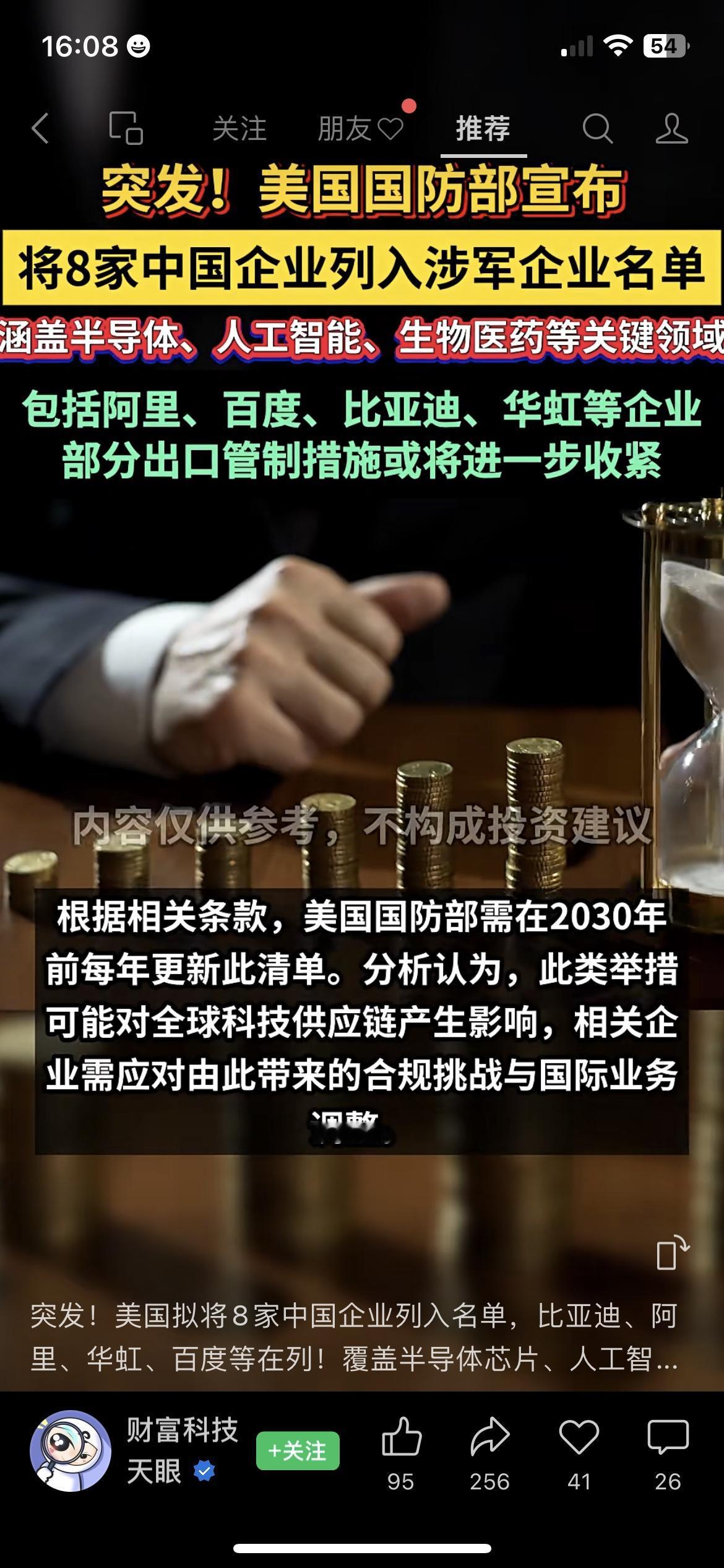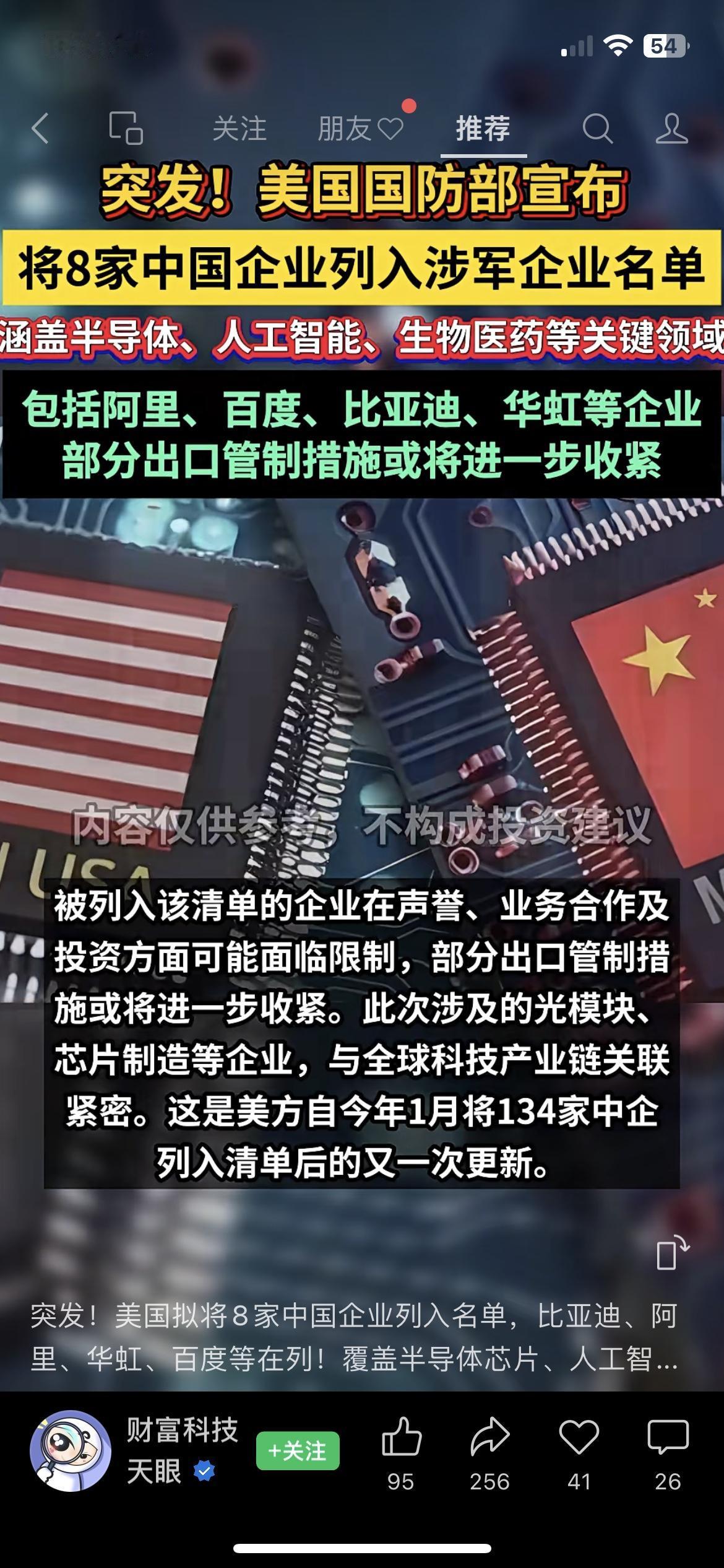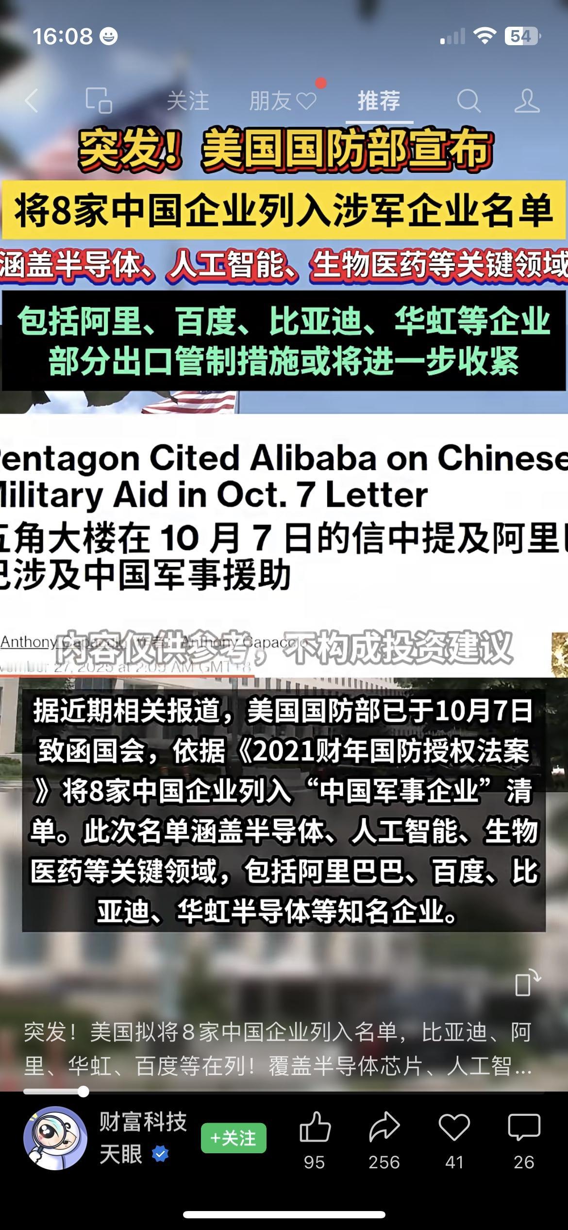 突发!美国又搞事:阿里/比亚迪等8家中国企业被“盯上”了! 刚刷到的最新消息——美国国防部已经给国会递了建议,要把阿里、百度、比亚迪、华虹这些咱们的头部企业,一共8家,都塞进那个所谓的“涉军企业清单”里! 不过先说明白哈:现在只是“建议列入”,还没正式生效呢。但你看这操作多针对性——专挑半导体、AI、新能源这些咱们正使劲儿突破的领域卡,明摆着是想拦咱们的科技发展。更气人的是,他们还说这清单以后每年都要更新… 咱就是说,越被这么卡脖子,越得把核心技术攥在自己手里!你们觉得这些企业能扛住这波压力不?
