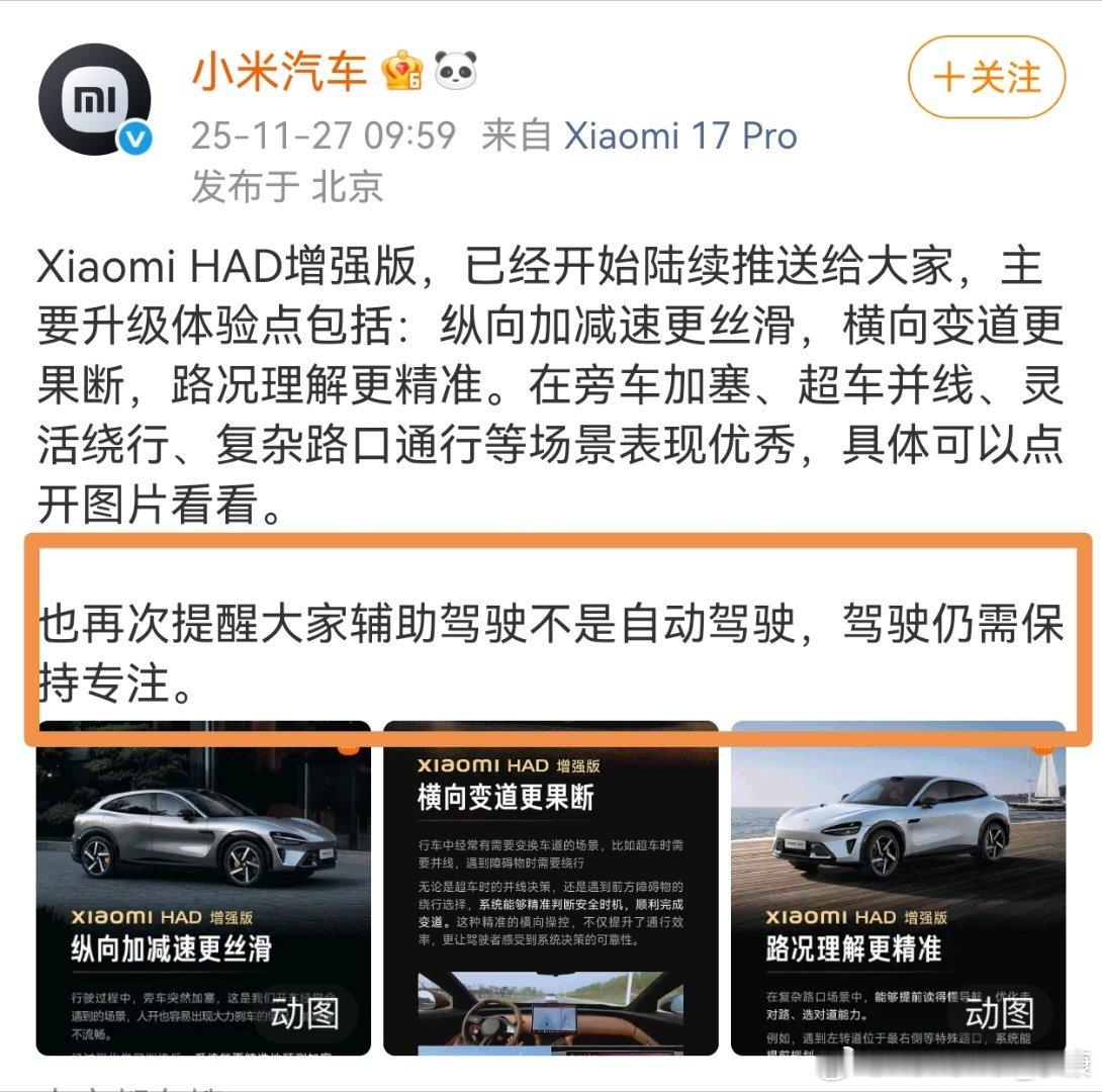 小米汽车不断重复,辅助驾驶不是自动驾驶,驾驶仍需保持专注。
