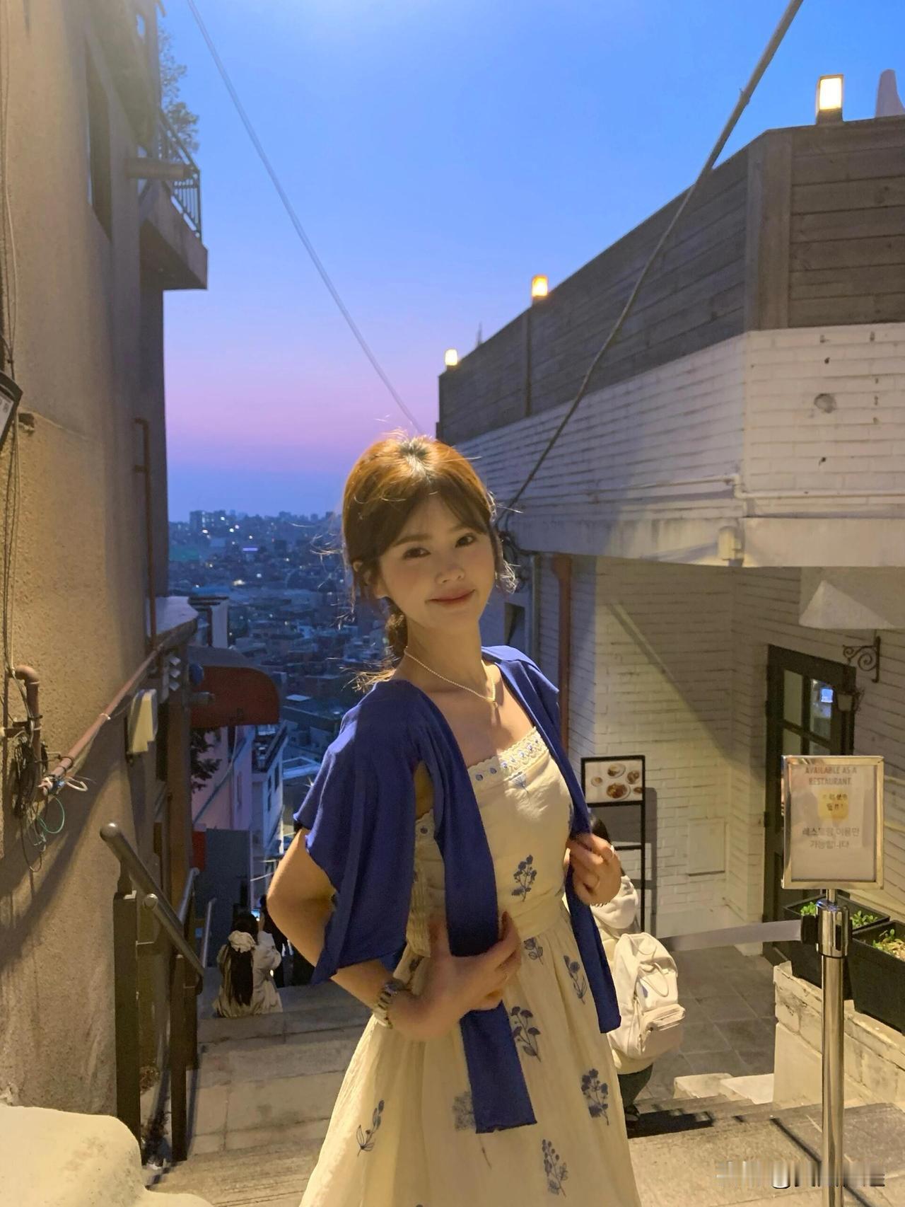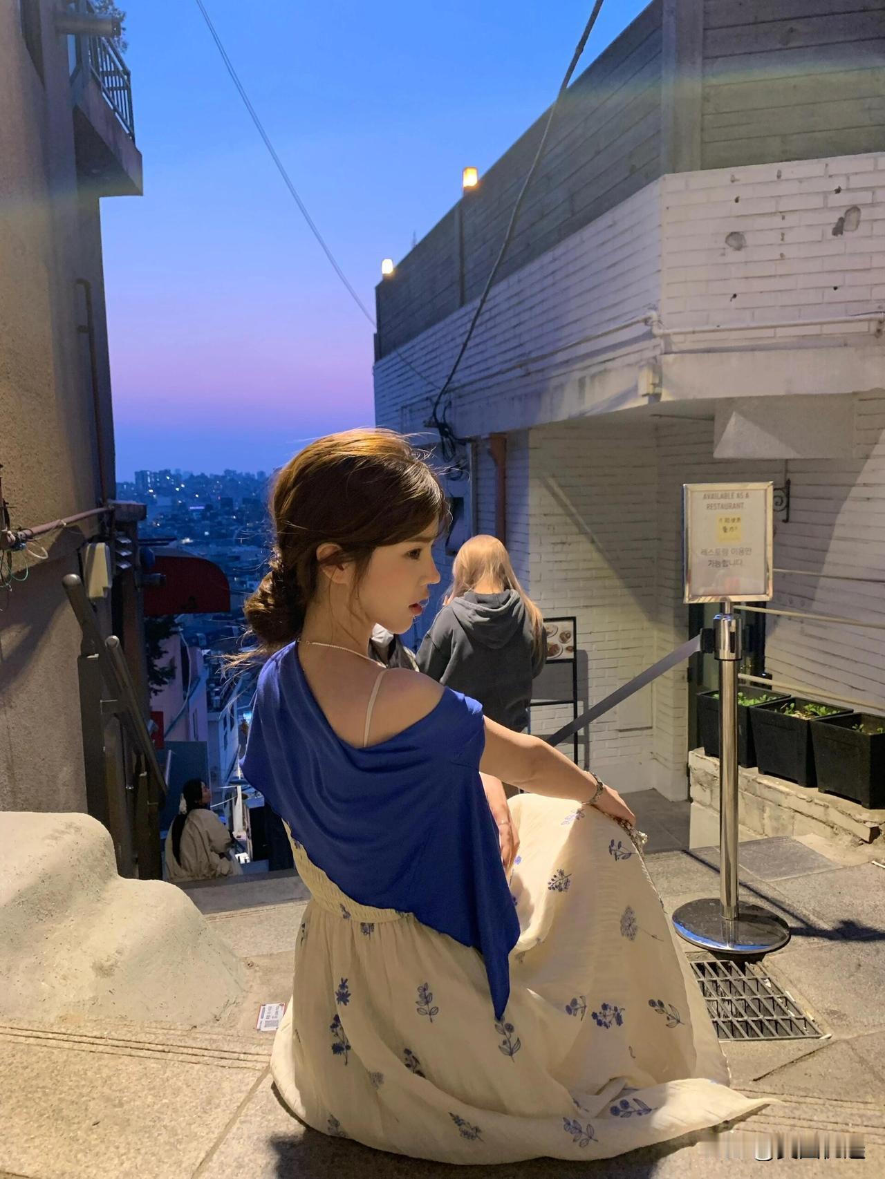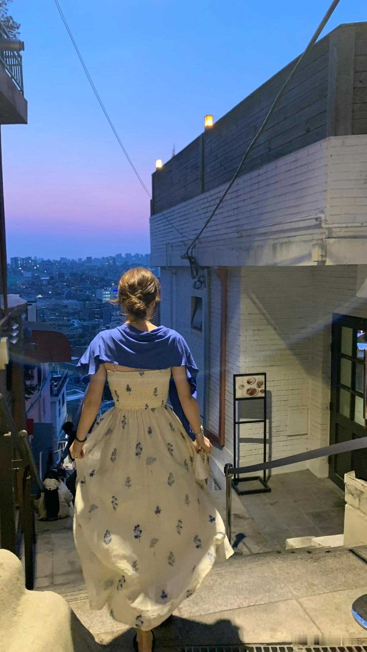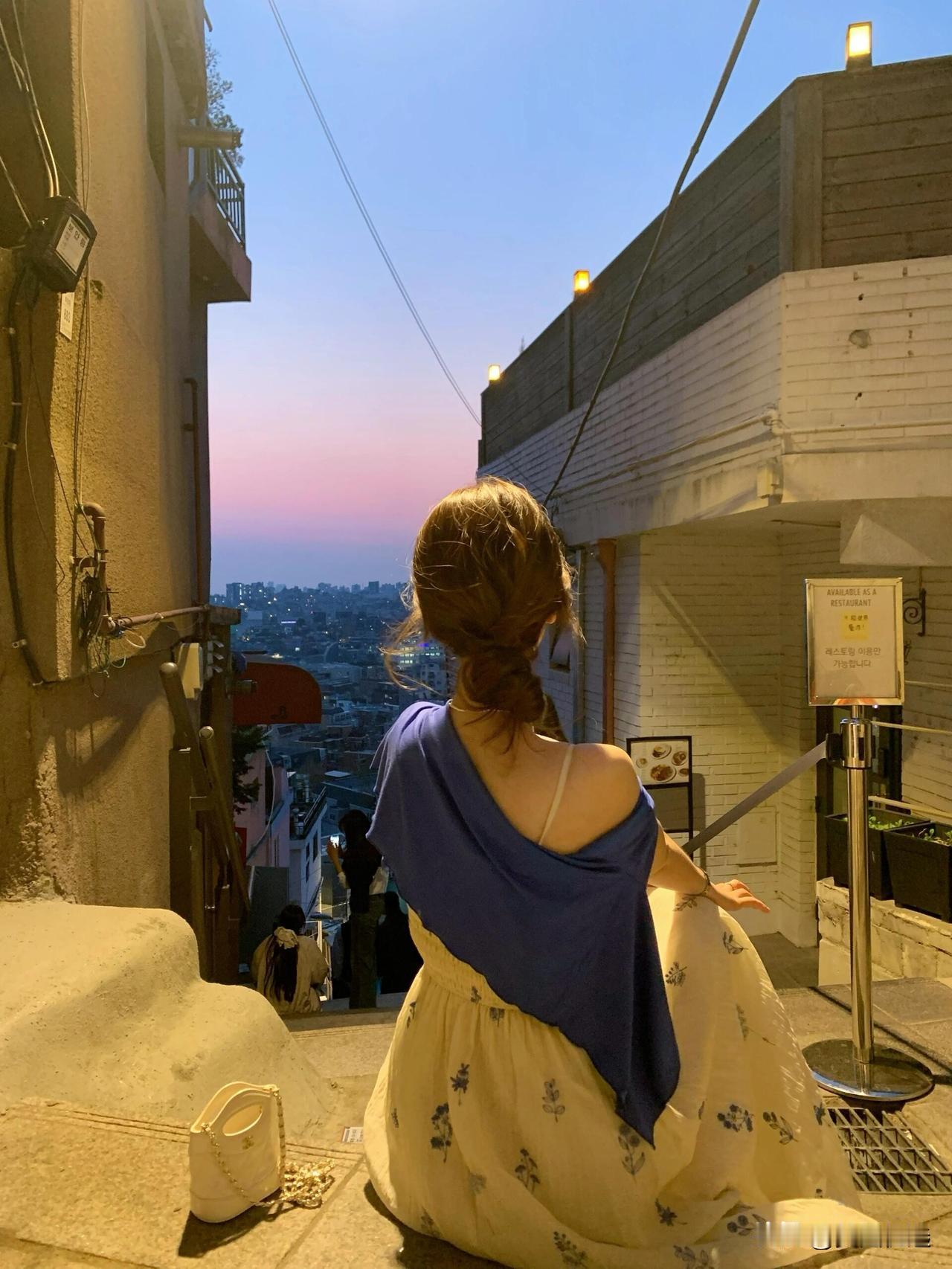 黄昏时分,少女漫步在城市阶梯,享受城市夜景的浪漫。