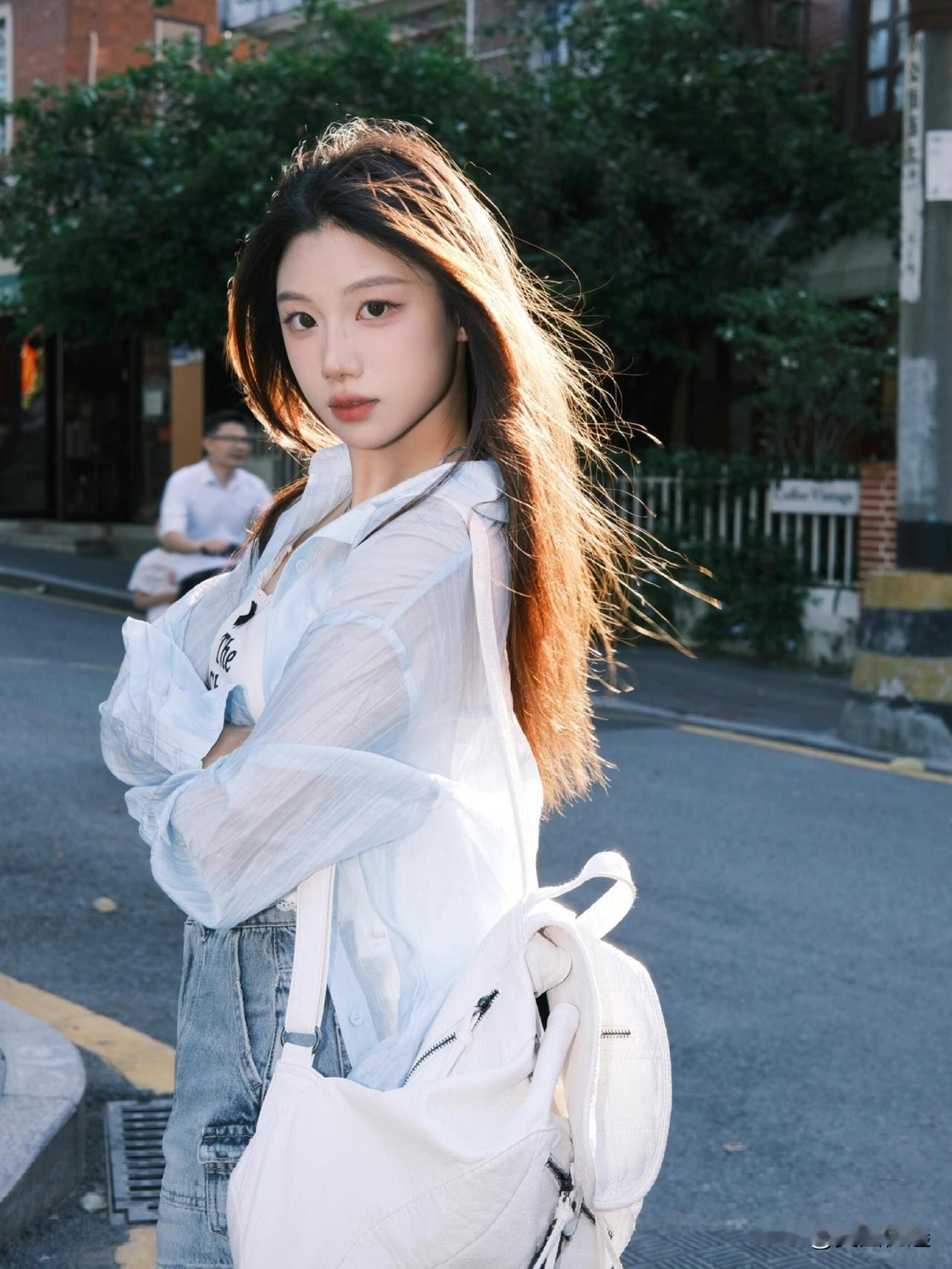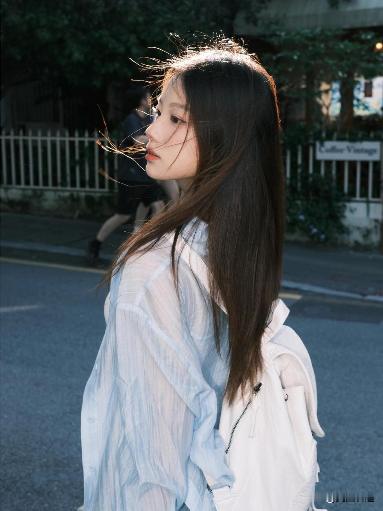 阳光下的温柔少女,背着白色背包,微风轻拂发梢,青春洋溢。