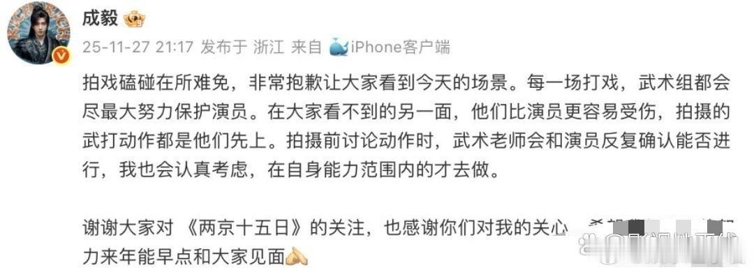 成毅发文回应拍摄《两京十五日》威亚戏时撞到头一事,向粉丝报平安。成毅表示:“拍戏磕碰在所难免,非常抱歉让大家看到今天的场景”、“拍摄前讨论动作时,武术老师会和演员反复确认能否进行,我也会认真考虑,在自身能力范围内的才去做。