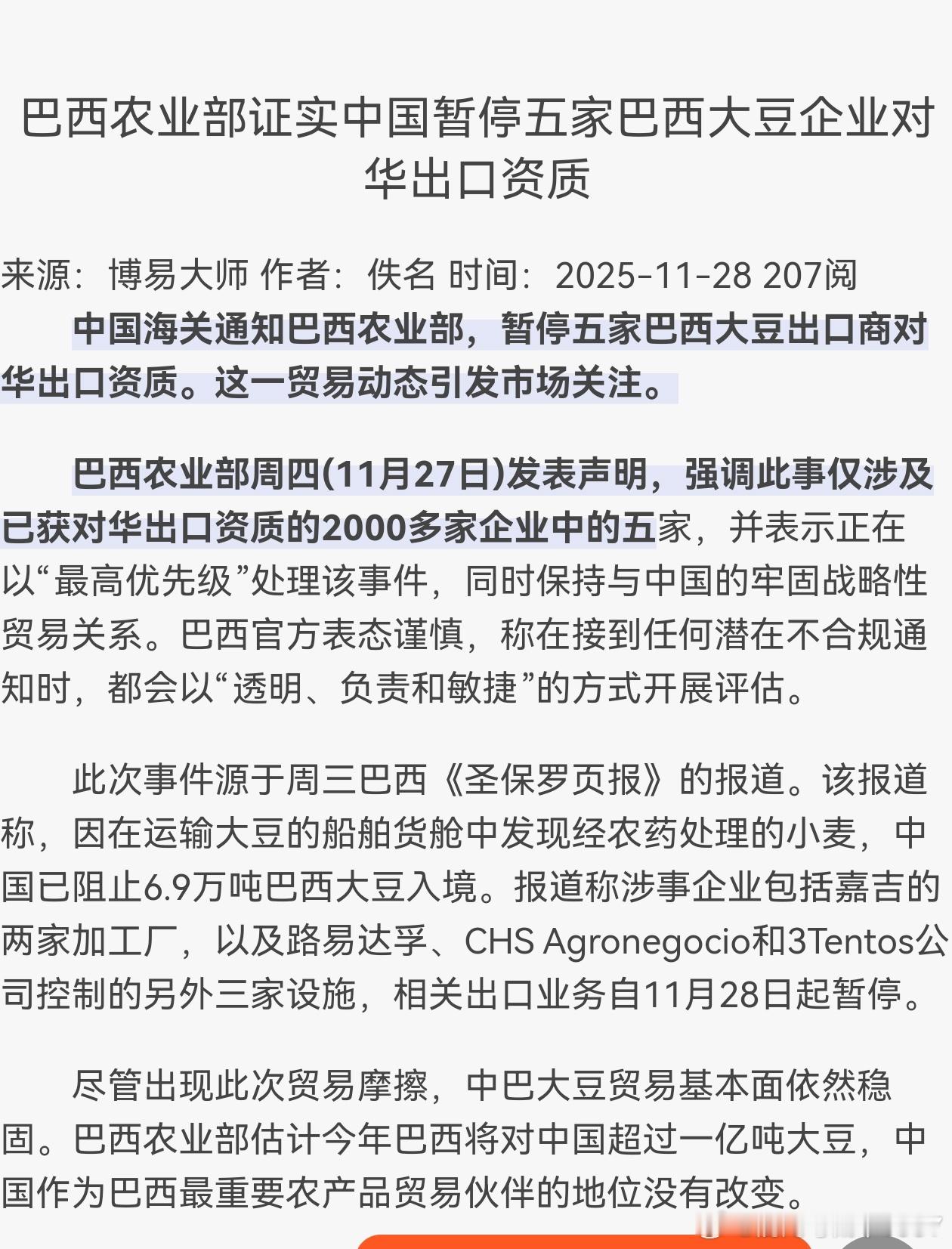 巴西农业部证实中国暂停五家巴西大豆企业对华出口资质现在不缺大豆,你得给我质量好的此次事件源于周三巴西《圣保罗页报》的报道。该报道称,因在运输大豆的船舶货舱中发现经农药处理的小麦,中国已阻止6.9万吨巴西大豆入境。报道称涉事企业包括嘉吉的两家加工厂,以及路易达孚、CHS Agronegocio和3Tentos公司控制的另外三家设施,相关出口业务自11月28日起暂停。  尽管出现此次贸易摩擦,中巴大豆贸易基本面依然稳固。巴西农业部估计今年巴西将对中国超过一亿吨大豆,中国作为巴西最重要农产品贸易伙伴的地位没有改变。