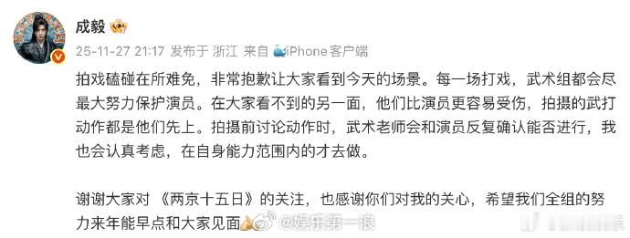 成毅回应两京十五日拍摄受伤两京十五日向成毅道歉 27日,发文报平安,“拍戏磕碰在所难免,非常抱歉让大家看到今天的场景。每一场打戏,武术组都会尽最大努力保护演员。在大家看不到的另一面,他们比演员更容易受伤,拍摄的武打动作都是他们先上。拍摄前讨论动作时,武术老师会和演员反复确认能否进行,我也会认真考虑,在自身能力范围内的才去做。”此前,成毅拍威亚戏时撞到头,引发热议。两京十五日官微向成毅道歉 《两京十五日》官微也向成毅道歉:“对于此次拍摄过程中发生的意外情况,我们对成毅老师致以最深的歉意。后续剧组会密切关注演员状态,一切以演员的健康安全为重。 同时,我们将以此次事件为戒,加强剧组安全规范措施,确保每一位演职人员的安全得到保障。”