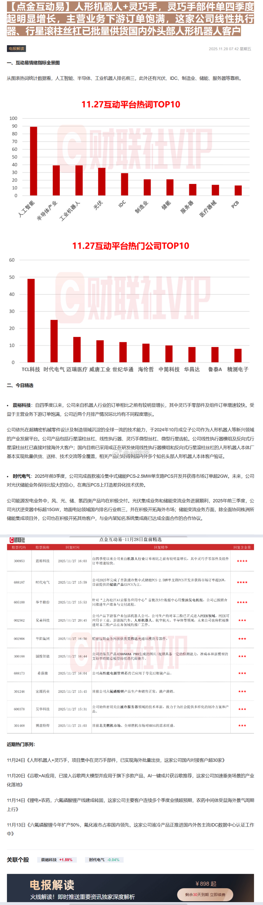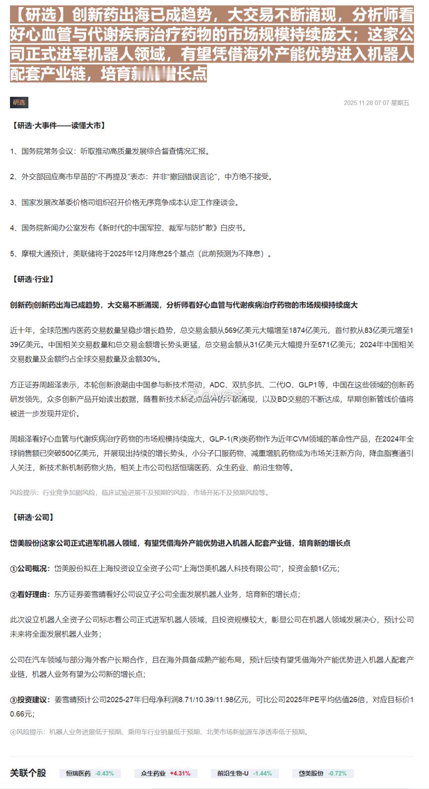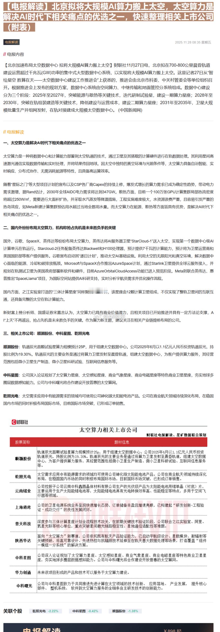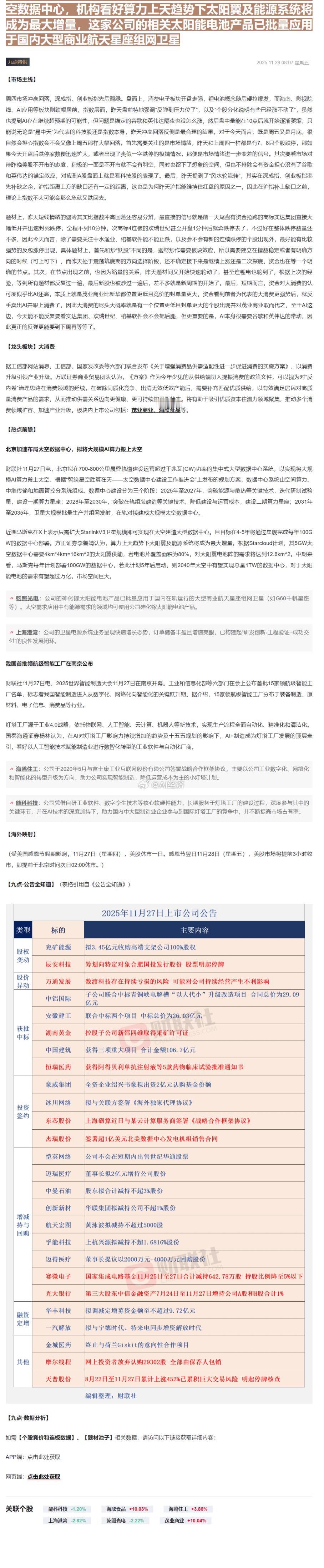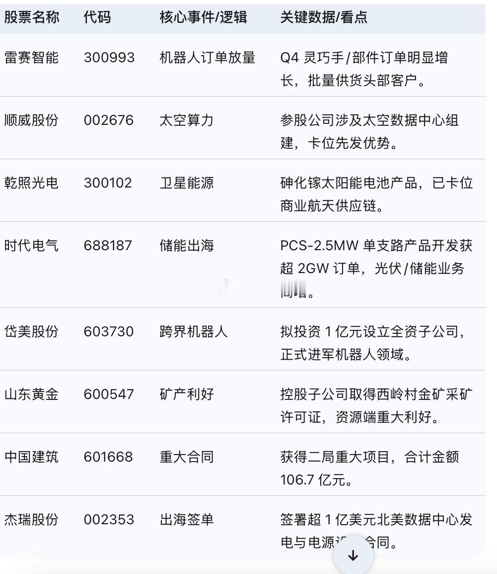 V+内容 大众试读【核心定性】🔴 宏观共振:资金审美从【纯题材】转向【落地与新基建】,市场进入“天地共振”的硬科技行情。【一、宏观经济:政策与流动性的双重变奏】📌 宏观面:国内政策端,北京强推【太空数据中心】建设,将 AI 基础设施从地面推向太空,这是继“东数西算”后的新维度,打开了宏观基建的新空间。海外方面,摩根大通预测美联储 2025 年降息预期仍在,流动性边际宽松利好成长股估值修复。📌 资金面:从互动平台热词(图片 5)来看,【人工智能】、【半导体】、【工业机器人】占据前三,资金抱团硬科技的趋势未变,但拥挤度开始提升,选股需更看重“业绩兑现”。【二、投资策略:哑铃型战法(重点)】🧭 核心打法:左手【确定性订单】,右手【高赔率新赛道】。1. 进攻【数据确权】:机器人板块切忌再盲目炒作 PPT 造车/造人。现在的核心策略是寻找【Q4 订单环比大增】的上游零部件厂商。有订单,才是真成长。2. 潜伏【太空新基建】:太空算力是 AI 的新分支。策略上要避开拥挤的纯卫星组网,重点卡位【航天级电源】、【空间散热】、【抗辐射芯片】这三类“卖铲人”。3. 防守【出海硬通货】:在全球宏观不确定性下,手握【北美/欧洲大额合同】的企业是避风港。【三、中观行业:赛道逻辑深度拆解】⚡ 赛道一:具身智能(机器人)逻辑升级:从【概念导入】进入【业绩验证】。图片数据显示,雷赛智能等上游厂商 Q4 灵巧手及部件订单“明显增长”。这意味着行业不再是空谈,整机厂开始批量拿货,零部件厂商率先受益。⚡ 赛道二:太空经济(Space Computing)逻辑重塑:算力上天解决【能耗】与【散热】痛点。不同于以往的卫星通讯,这次北京的政策指向“太空数据中心”。太空的真空环境(零散热成本)和无限太阳能是 AI 算力的终极解决方案,利好空间能源与热管理板块。⚡ 赛道三:高端制造出海逻辑验证:海外需求依然强劲。无论是创新药的 BD 交易,还是杰瑞股份拿下的北美数据中心发电设备大单,都证明了具备全球竞争力的中国制造依然能赚取高毛利外汇。【四、微观个股点评:逻辑映射与验证】📌 雷赛智能 (300993):【订单拐点】逻辑:机器人上游“卖水人”。核心看点是公告明确提到【Q4 灵巧手部件订单明显增长】,业绩拐点信号已现。📌 顺威股份 (002676) / 乾照光电 (300102):【太空基建】逻辑:顺威参股公司直接参与太空数据中心组建;乾照光电提供空间太阳能电池(能源核心)。二者均为“算力上天”的核心配套。📌 岱美股份 (603730):【跨界降维】逻辑:传统汽配龙头拿 1 亿砸向机器人。逻辑是【技术复用】和【产能现成】,比新势力更具量产确定性。📌 杰瑞股份 (002353):【出海大单】逻辑:签署超 1 亿美元北美数据中心合同。验证了 AI 算力建设对电力设备的强劲需求。【五、技术与情绪分析】📈 情绪指标:根据互动平台热度图(图片 5),TCL 科技、时代电气、雷赛智能位列个股热度前列。⚠️ 风险提示:【人工智能】热度断层第一,这通常意味着板块分歧将加大。操作指引:对于高热度的机器人板块,建议沿 5 日线持股,一旦破位需减仓;对于刚启动的“太空算力”板块,目前处于低位发酵期,可逢低吸纳龙头。投资策略机器人太空经济A股研报梳理
