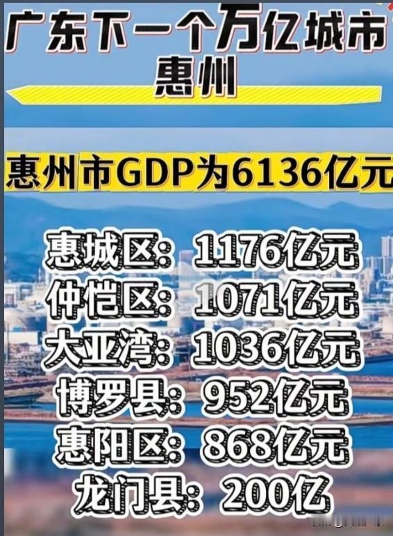 惠州的经济为何如此出色? 实际上,有一个极为关键的原因。重中之重便是其地理位置,大家是否留意到?惠州涵盖龙门、博罗、惠城、惠阳、惠东这五个县市区。其中,龙门与广州市毗邻,和广州增城、从化相距较近;博罗和惠城则与东莞紧密相连;惠阳离深圳很近,还是深圳的产业转移地;惠东是靠海的县城。 正因如此,惠州得益于广州、东莞、深圳这三个经济体量巨大的城市的辐射,想不发展都难,稍微努把力,便能收获颇丰。惠州是广东第五大城市,经济总量位居第五,仅次于深圳、广州、佛山、东莞。惠州去年的GDP是6100多亿,惠州有望成为下一个经济总量破万亿的城市,按此发展趋势,乐观估计 5 年,保守估计 8 年,惠州也能够突破万亿大关。 由此可见,地理位置至关重要,大家认同吗? 惠州 惠州风景 惠州全景 惠州行政区划 惠州经济现状 惠州变迁 惠州城市街景