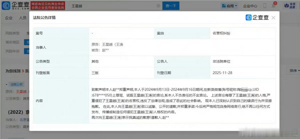 王星越告嘿成功,嘿子给他道歉了!