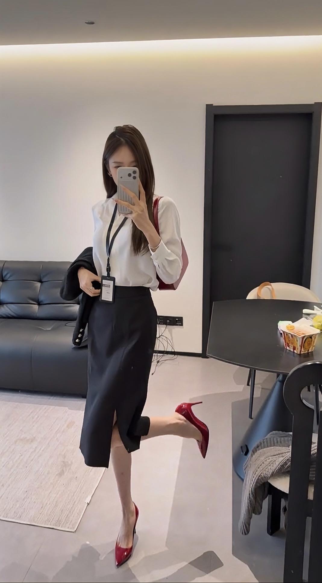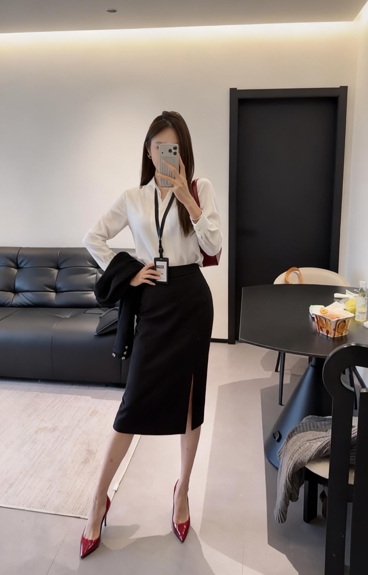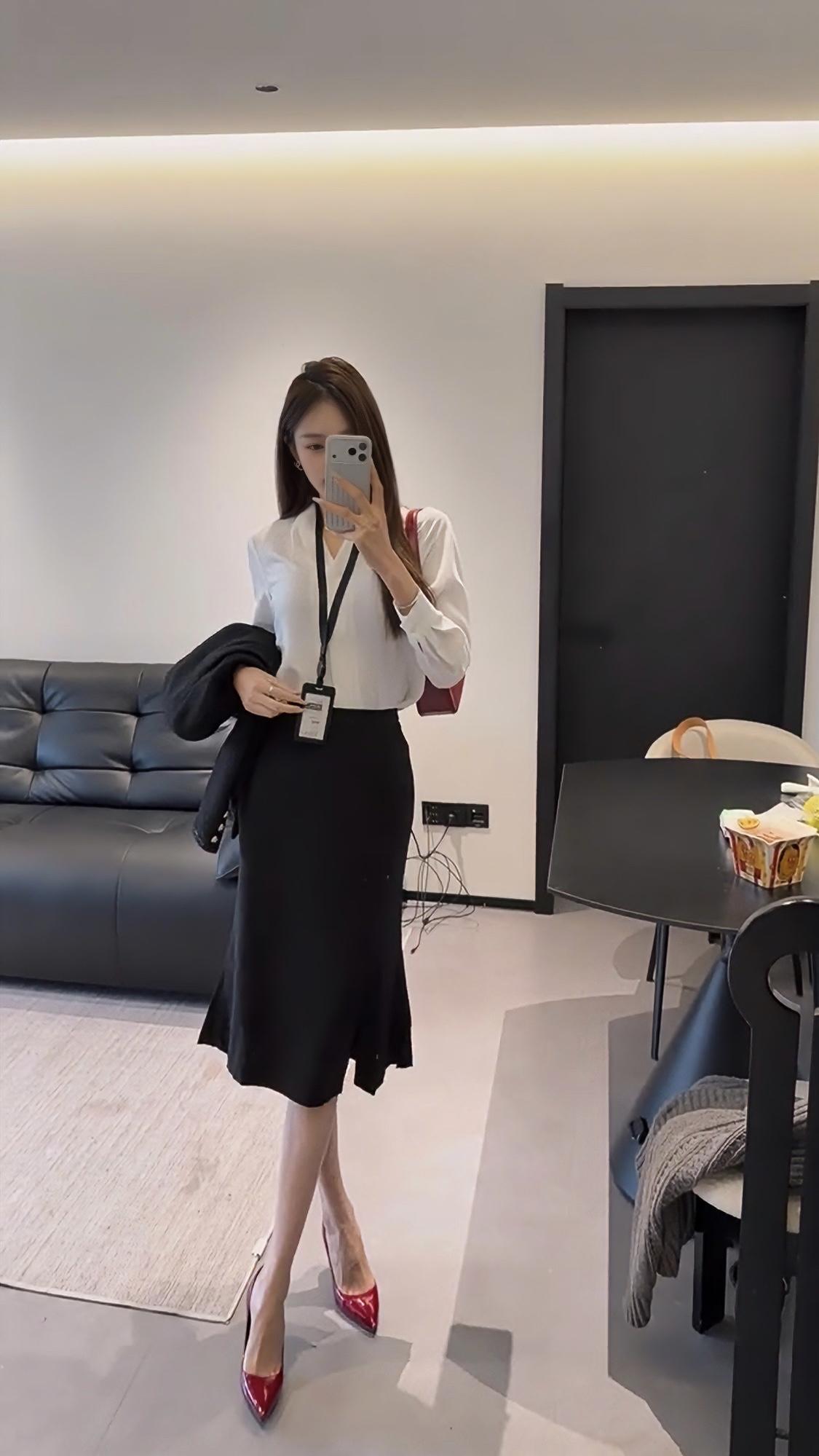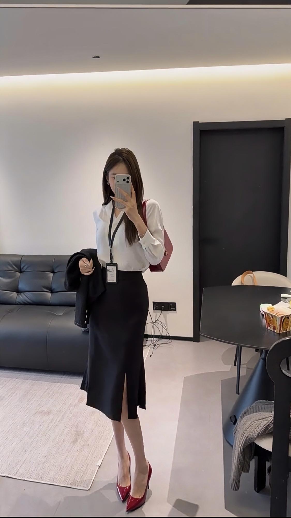 今日推荐:干练通勤风,整体搭配优雅又不失精致感: 上衣:白色V领衬衫,质感轻薄显气质。 下装:黑色开叉鱼尾半裙,修身版型+开叉设计,既保留了职场的正式感,又增加了女性化的柔美; 配饰:红色漆皮高跟鞋提亮整体。 外衣搭配西服、双面呢大衣、皮草都可以。 适合的场合:日常职场、通勤、轻社交场合都可以完美适配。
