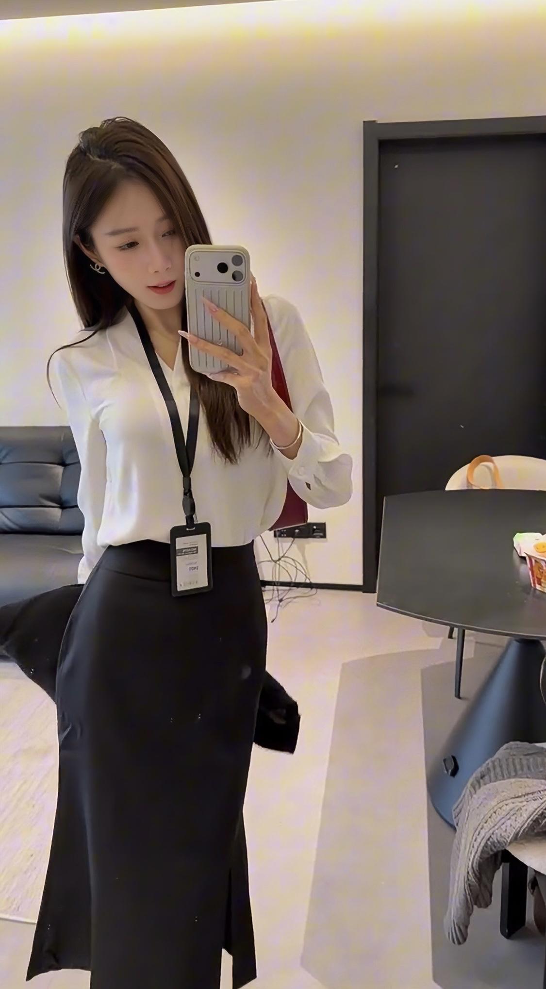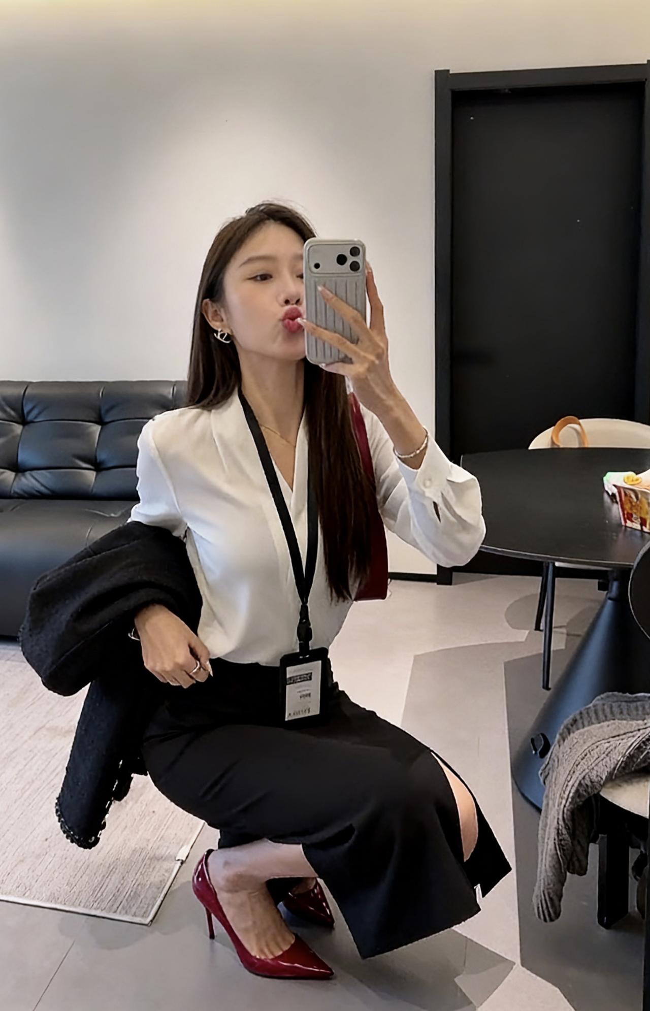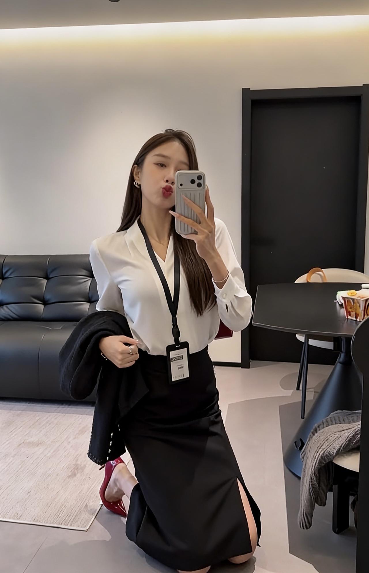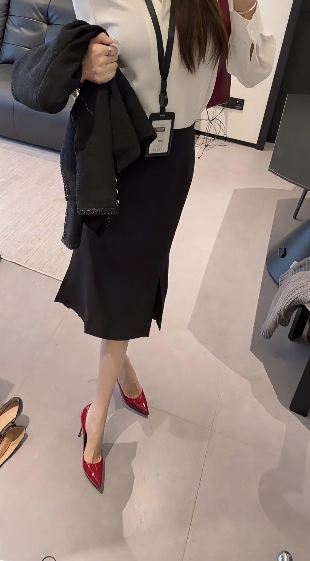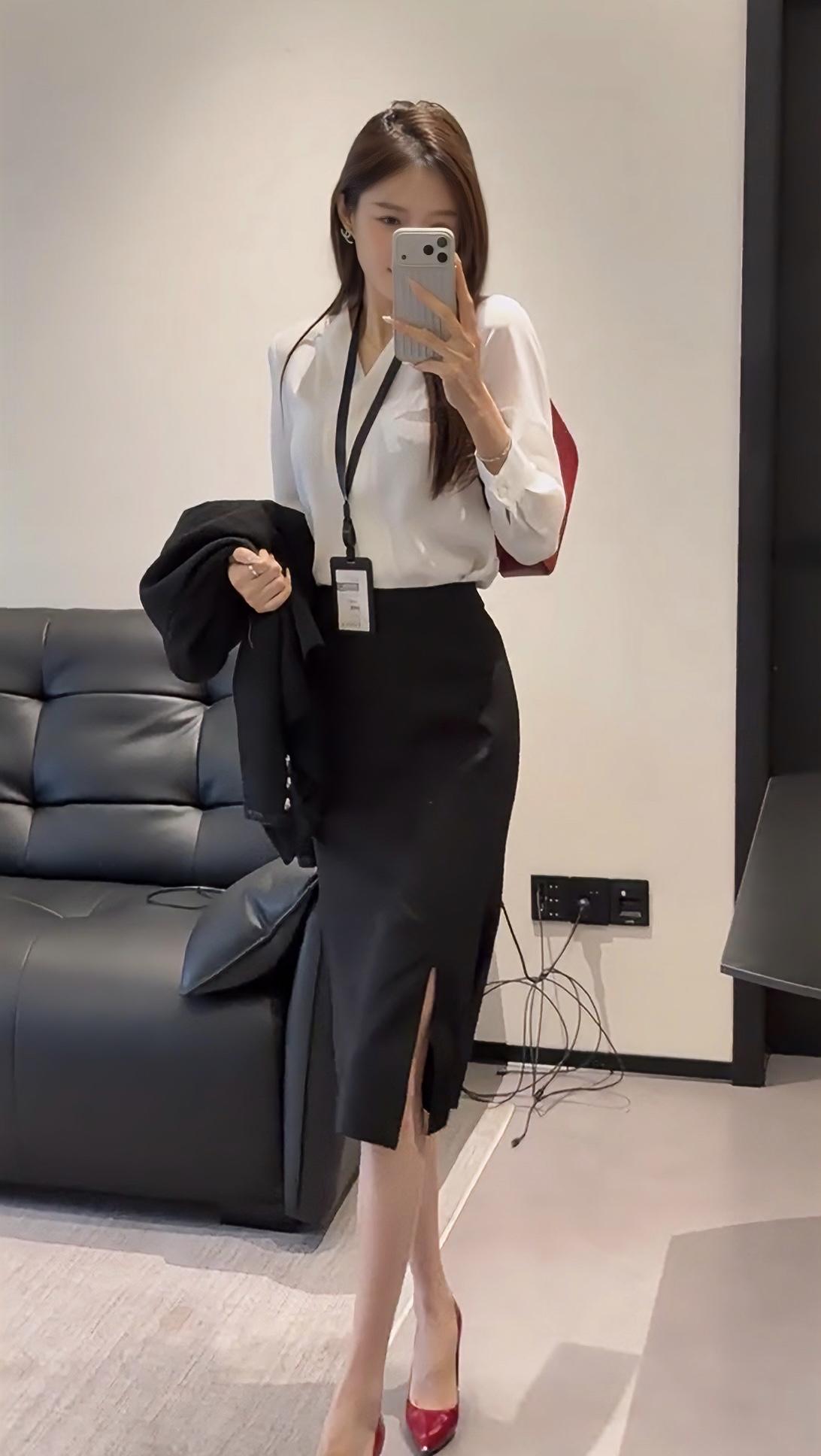 今日推荐:干练通勤风,整体搭配优雅又不失精致感: 上衣:白色V领衬衫,质感轻薄显气质。 下装:黑色开叉鱼尾半裙,修身版型+开叉设计,既保留了职场的正式感,又增加了女性化的柔美; 配饰:红色漆皮高跟鞋提亮整体。 外衣搭配西服、双面呢大衣、皮草都可以。 适合的场合:日常职场、通勤、轻社交场合都可以完美适配。