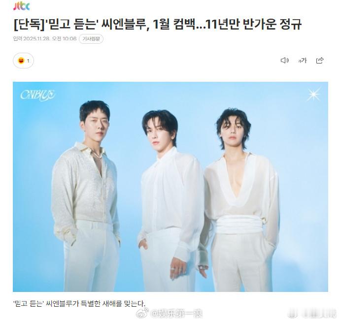CNBLUE明年1月回归 28日据多位歌谣界相关人士透露,CNBLUE将于明年1月初发行新正规专辑。