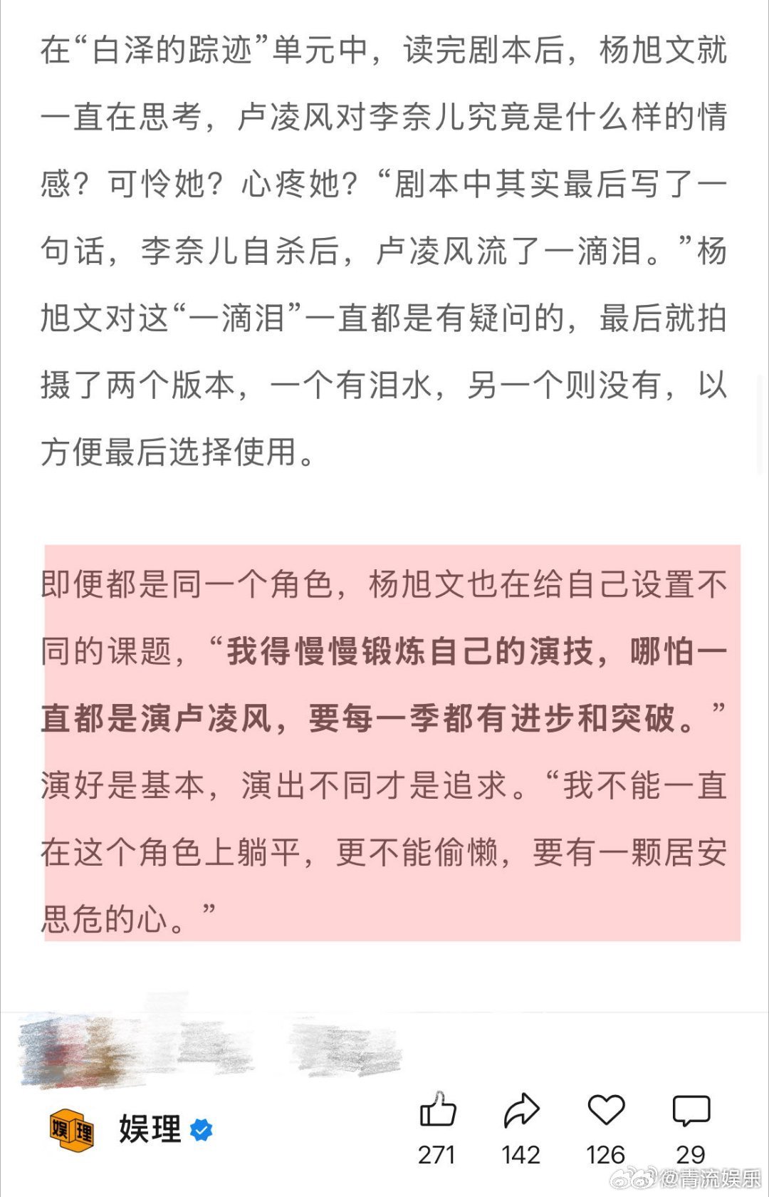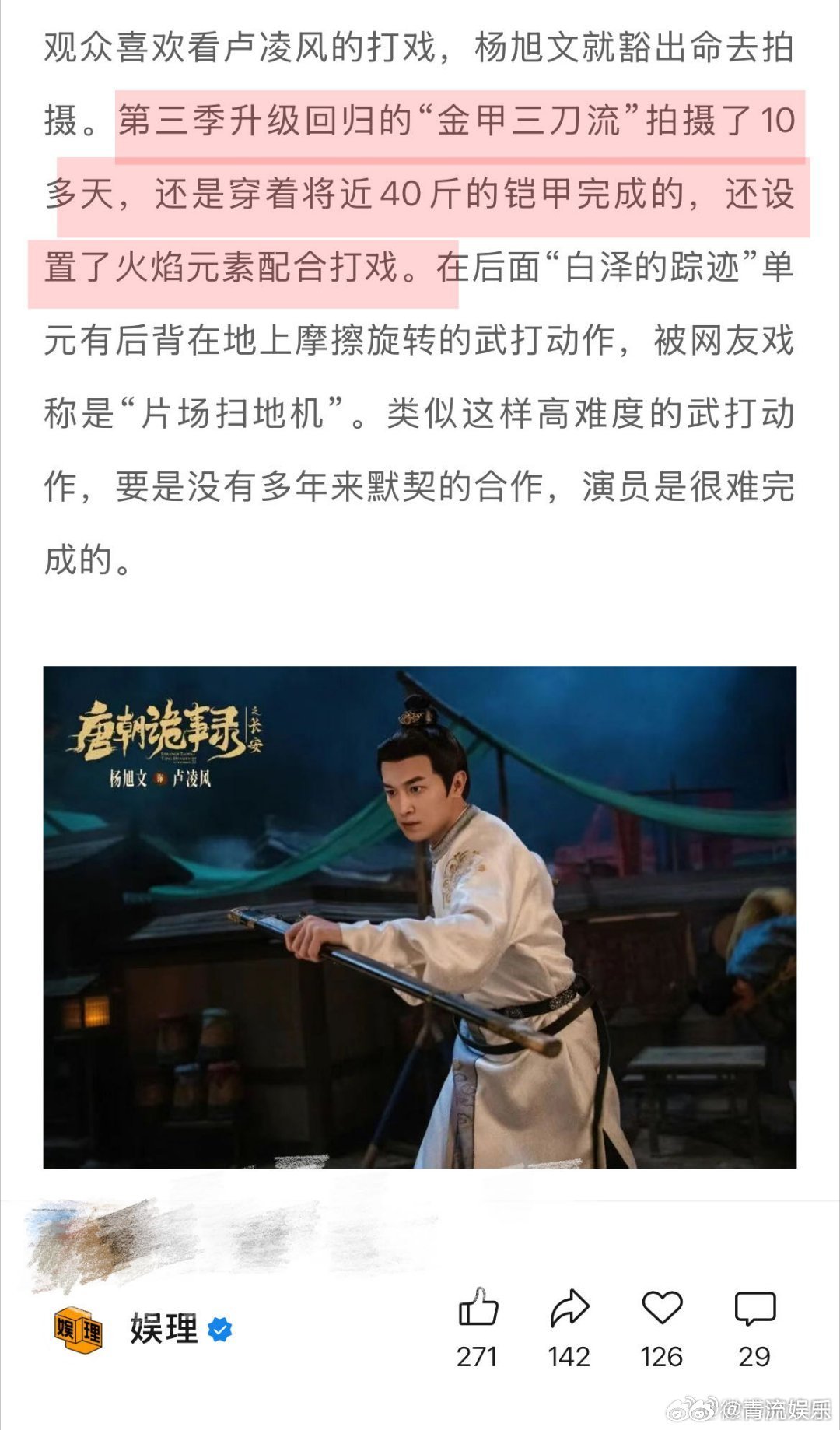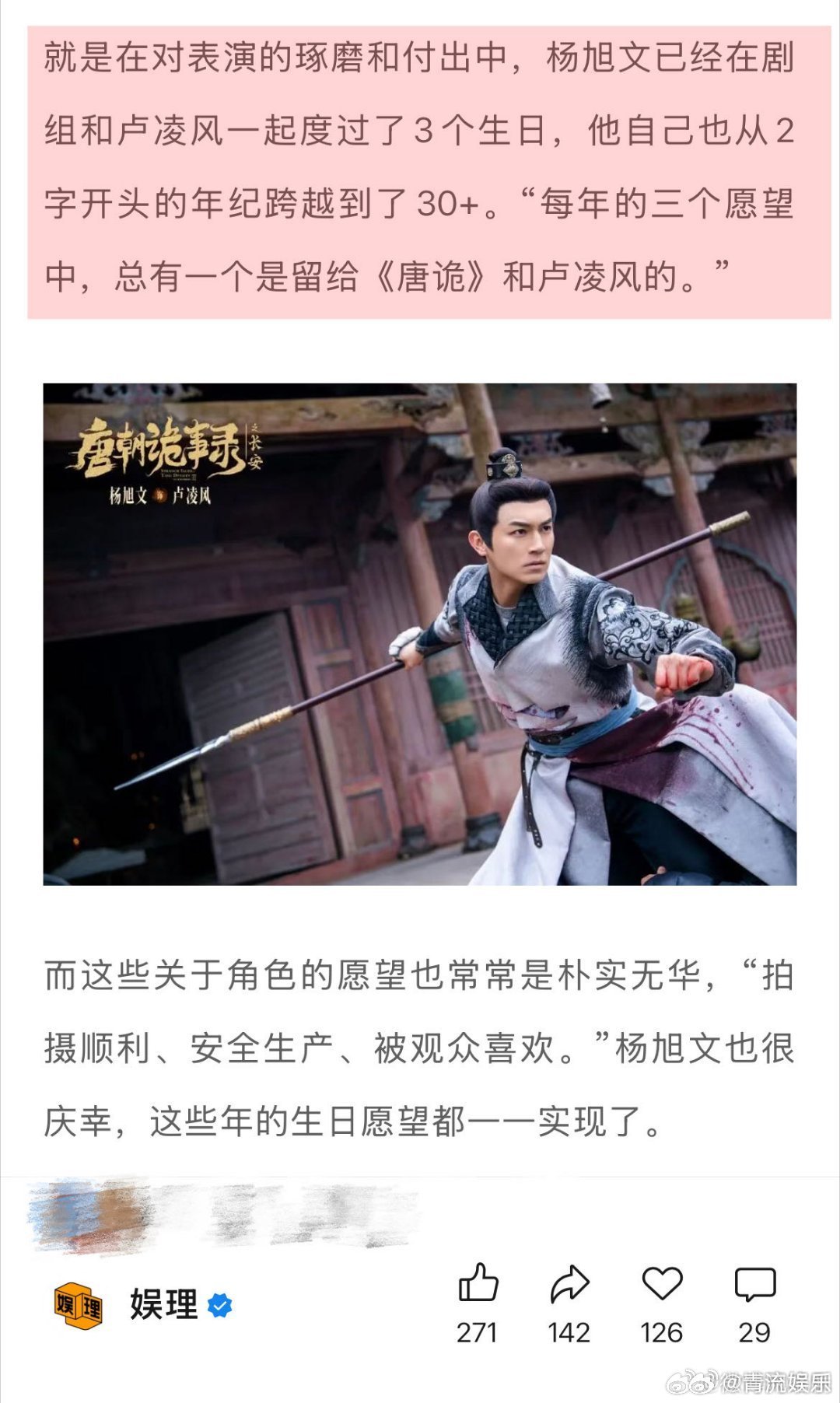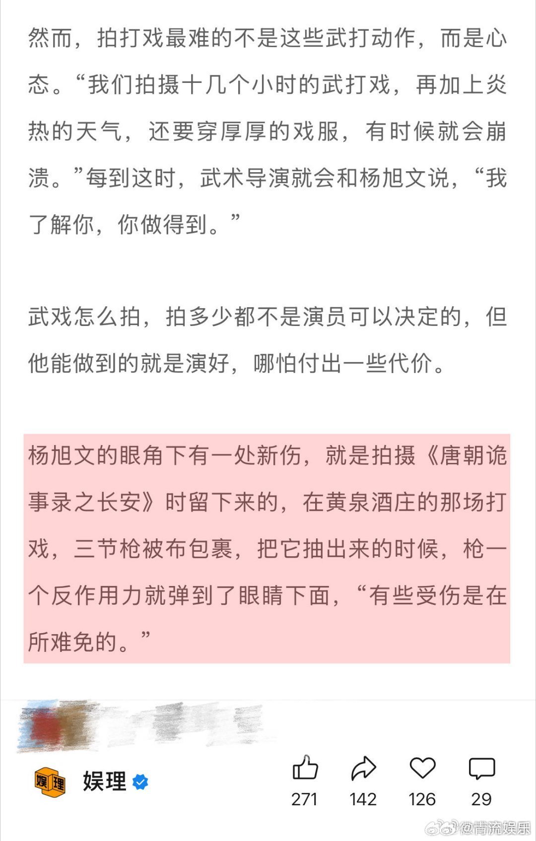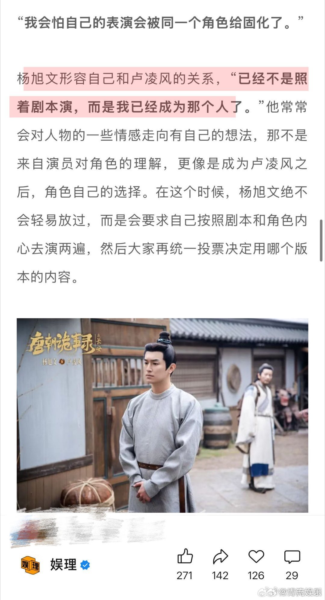 杨旭文说不是演而是成为卢凌风杨旭文因唐诡打戏眼角受伤 形容自己和卢凌风的关系,“已经不是照着剧本演,而是我已经成为那个人了。”他常常会对人物的一些情感走向有自己的想法,那不是来自演员对角色的理解,更像是成为卢凌风之后,角色自己的选择。在这个时候,杨旭文绝不会轻易放过,而是会要求自己按照剧本和角色内心去演两遍,然后大家再统一投票决定用哪个版本的内容。 唐朝诡事录之长安