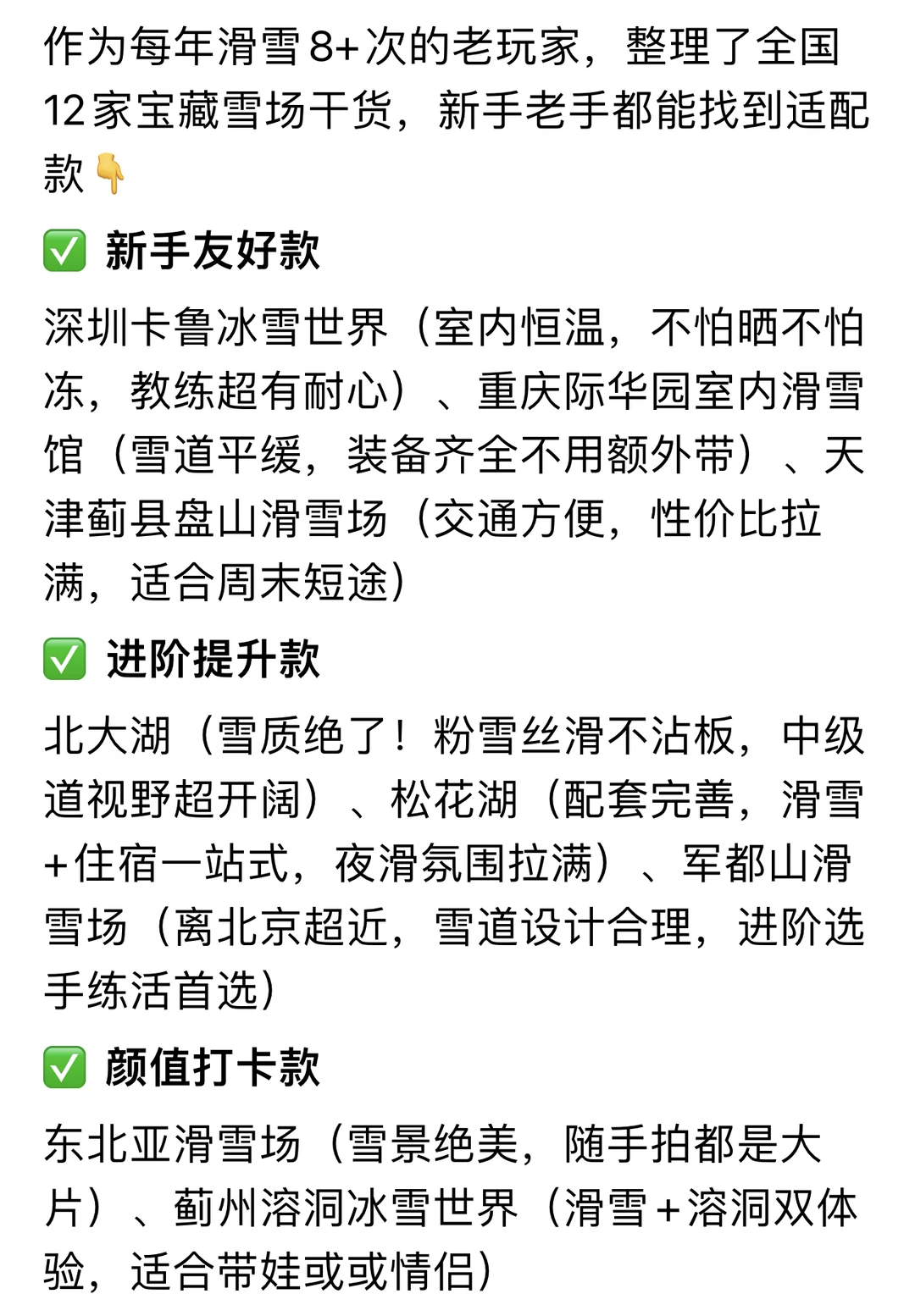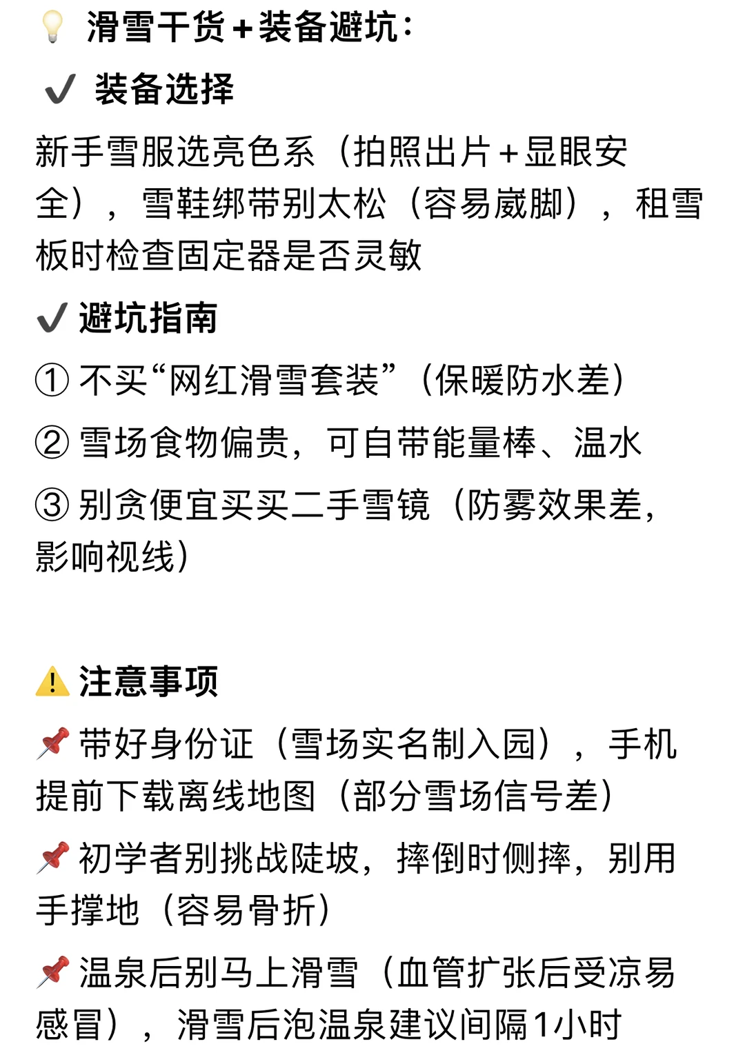 ✔️避坑指南:不买“网红滑雪套装”(保暖防水差)自带能量棒、温水省钱,别贪便宜买二手雪镜(防雾效果差,影响视线)