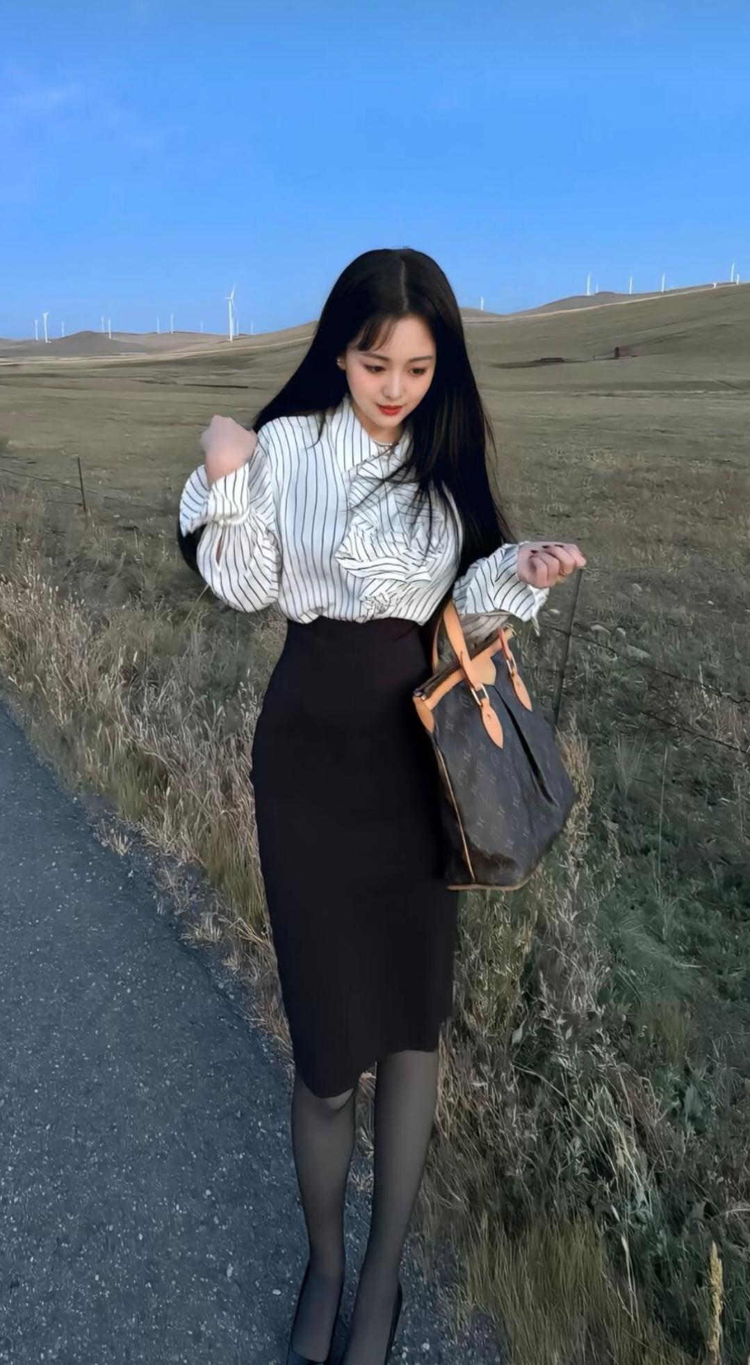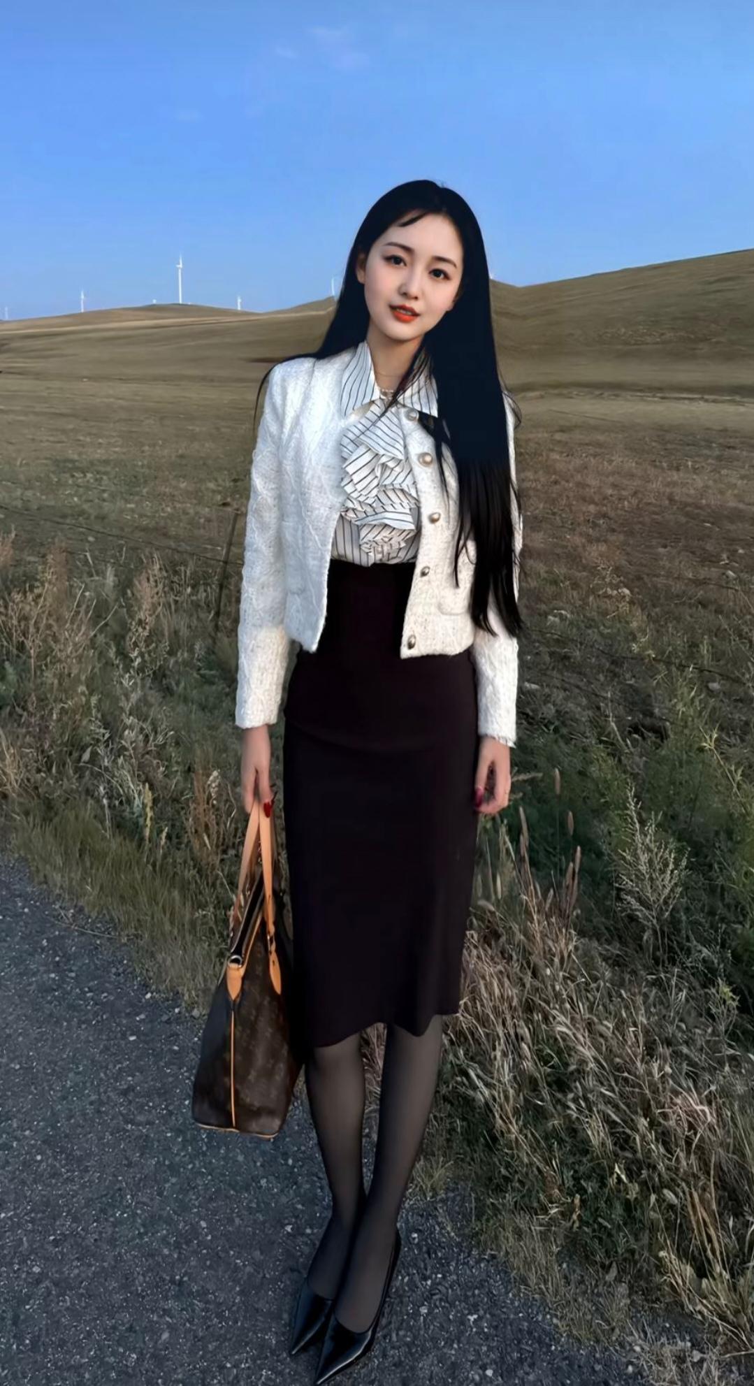 草原上的时尚女郎,黑裙白衣,优雅动人。