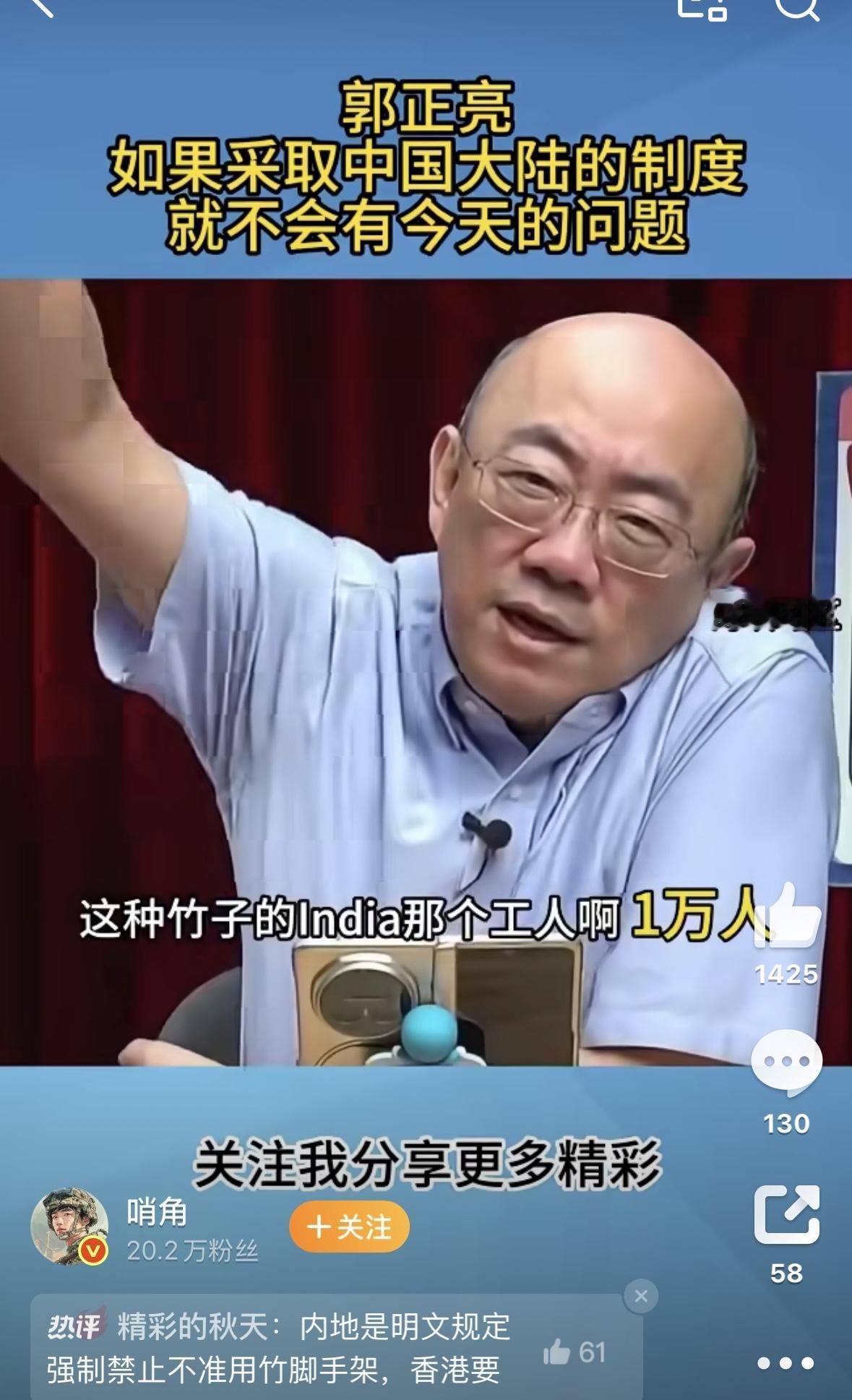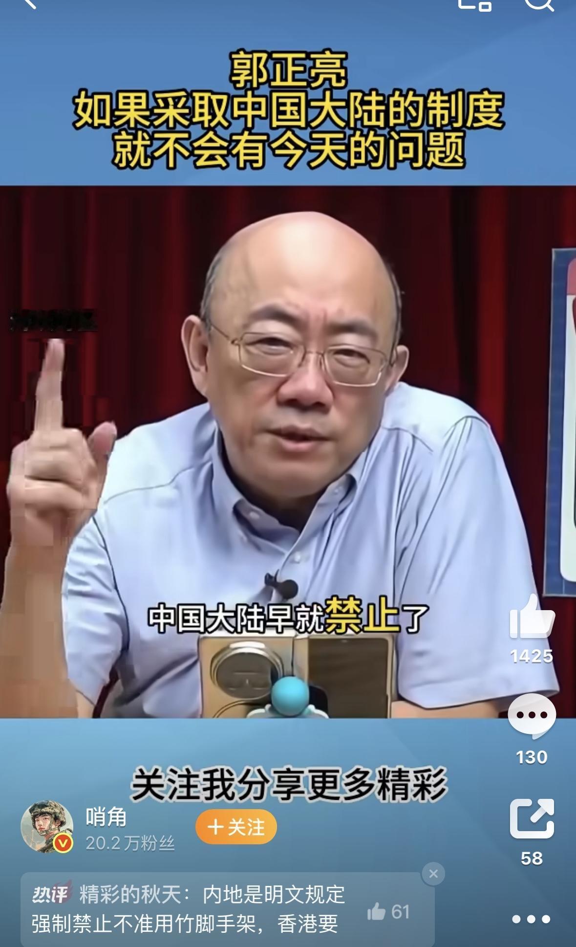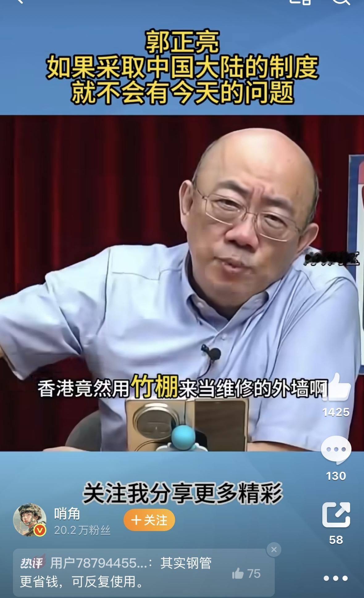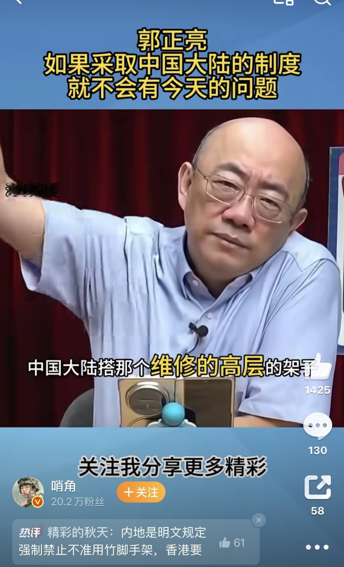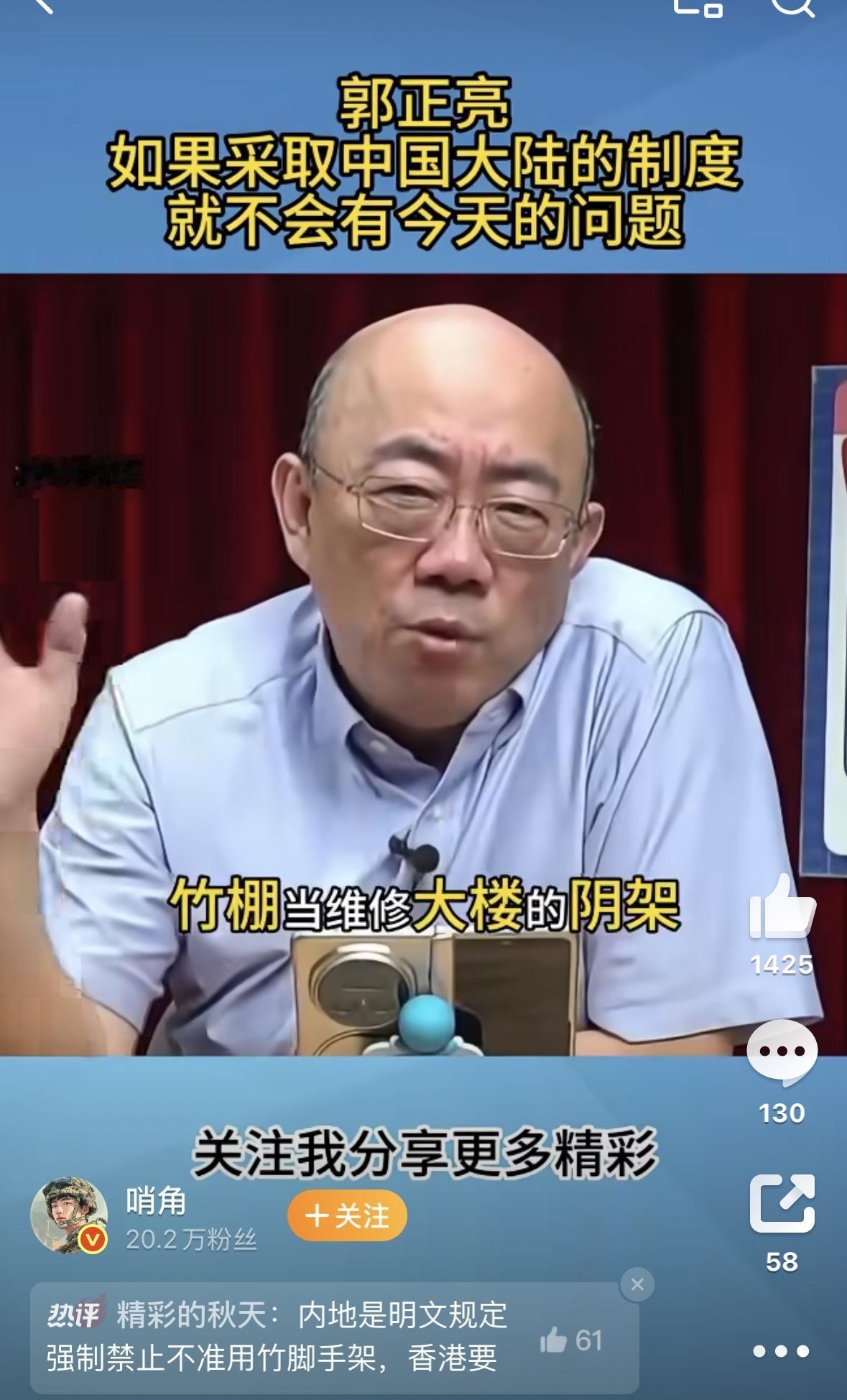 郭正亮这是胡扯,事故原因还没有结论,竹棚这个工具使用100多年了,火灾这种事故往往都是责任事故,竹棚不会自己着起来。这场大火,更和制度无关,香港的“一国两制”是我党的历史性选择,是最符合香港社会发展的社会制度,我们要长期坚持不动摇,否定香港坚持“一国两制”的行为,别有用心,这是典型的低级红高级黑,为“台独分子”否定我党“一国两制”政策背书!另外,内地高层施工,有很多施工方案,不是钢脚手架代替竹棚这么简单?具体情况具体分析,我们能不担心,内地发生其他火灾事故,其他责任事故的时候,你是不是也否定了内地的社会制度?