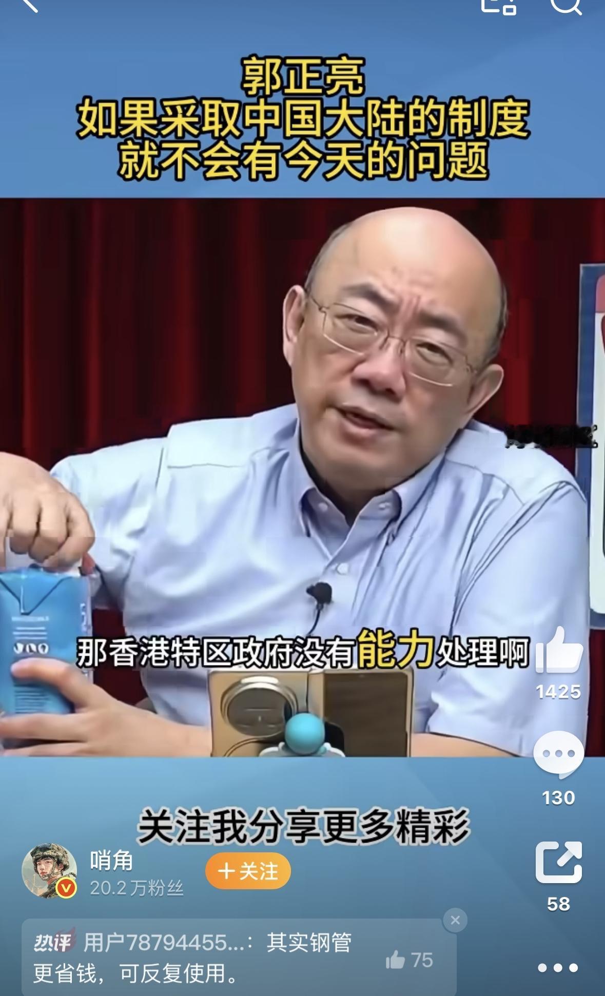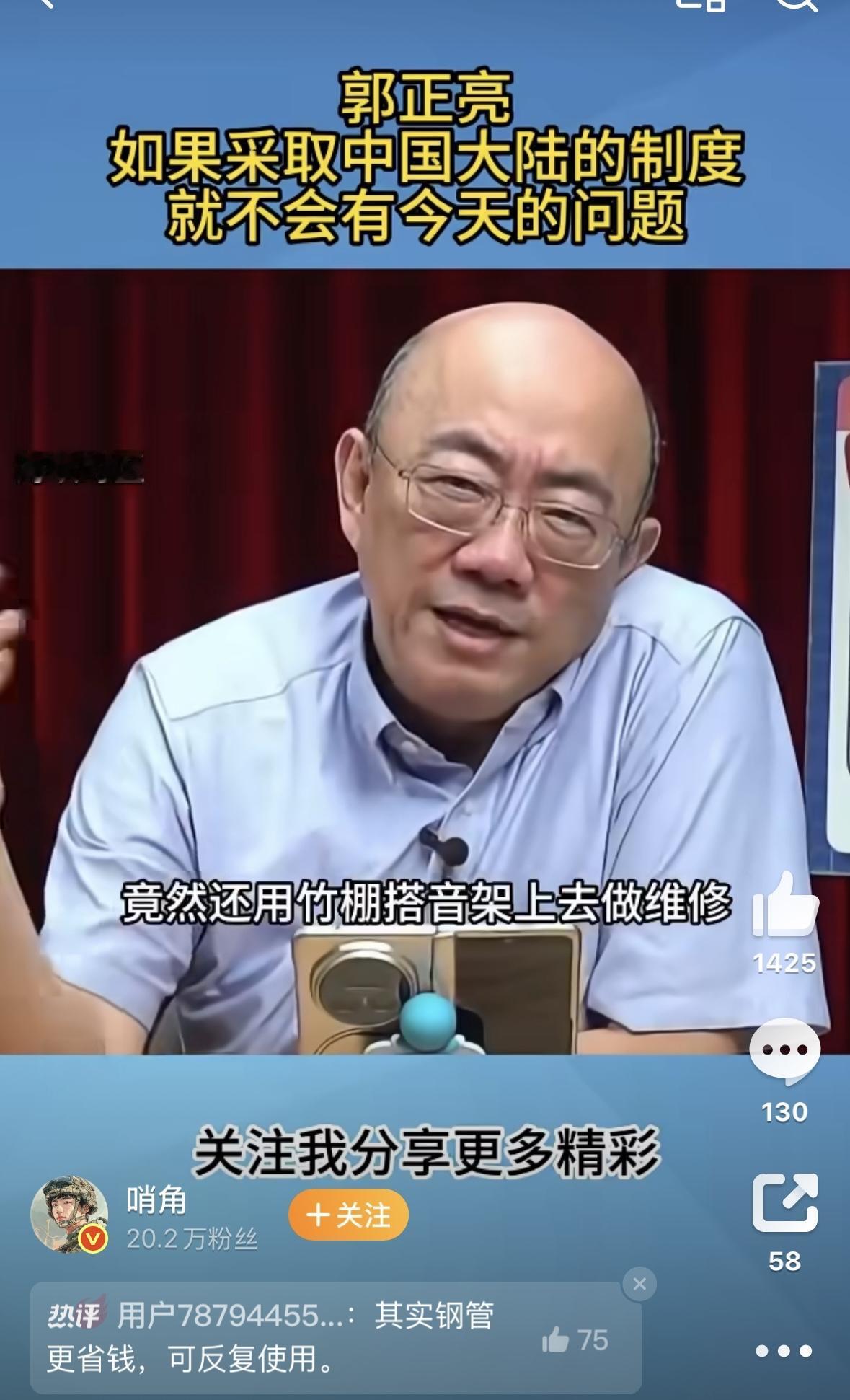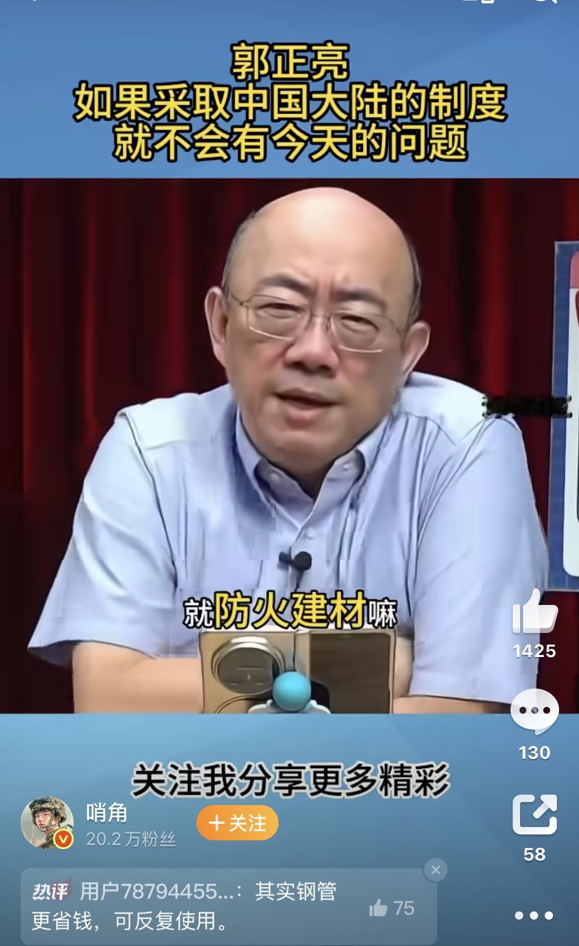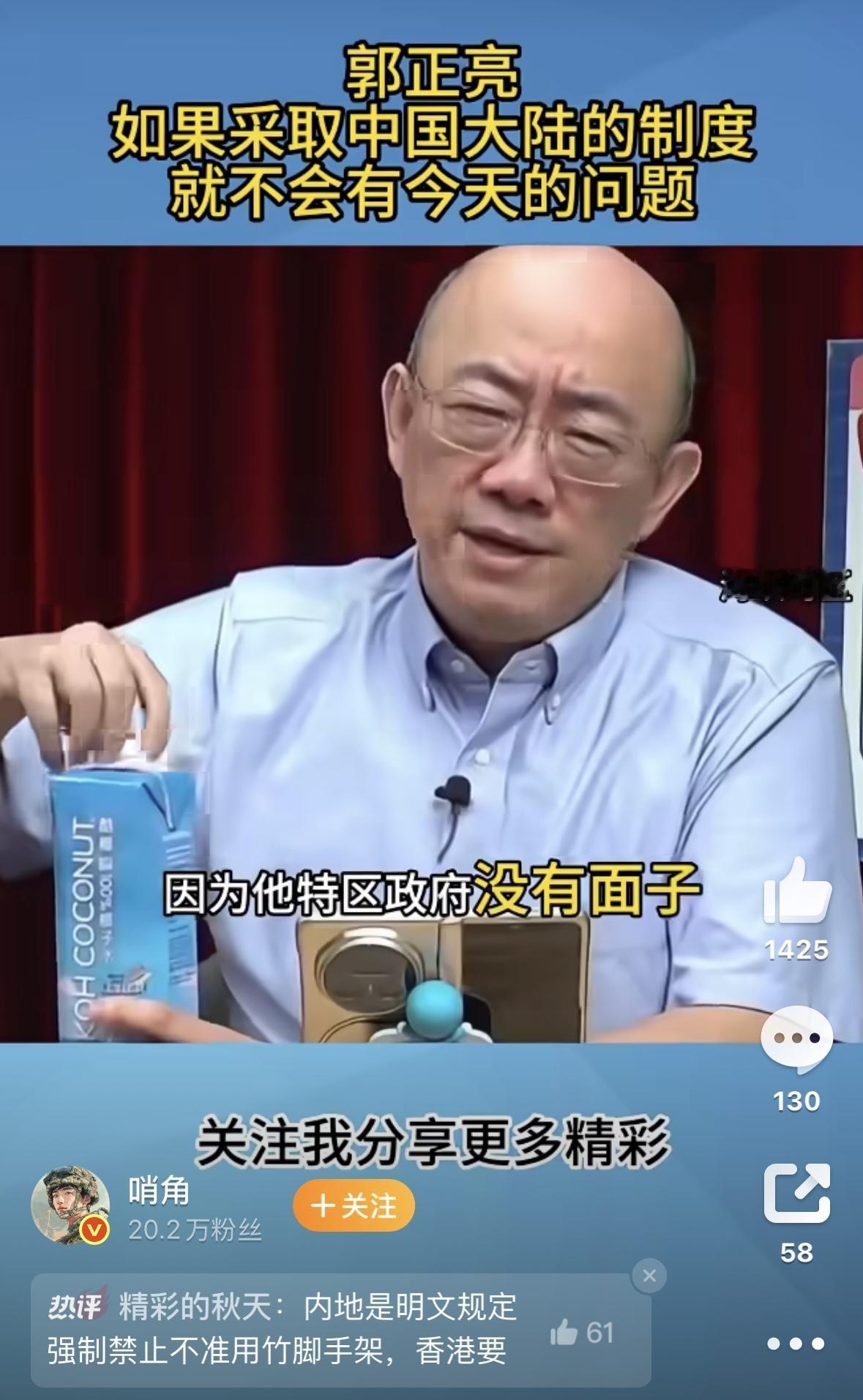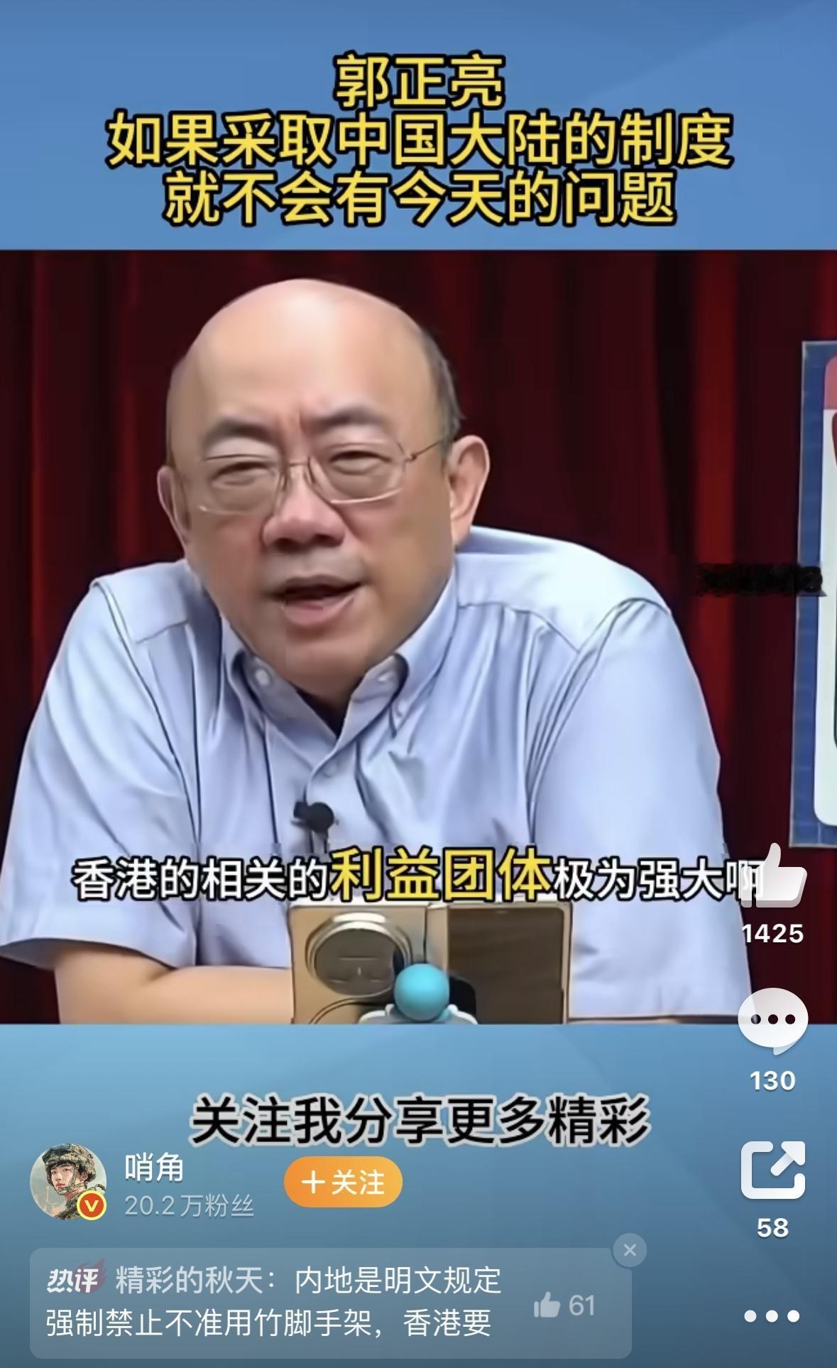 郭正亮这是胡扯,事故原因还没有结论,竹棚这个工具使用100多年了,火灾这种事故往往都是责任事故,竹棚不会自己着起来。这场大火,更和制度无关,香港的“一国两制”是我党的历史性选择,是最符合香港社会发展的社会制度,我们要长期坚持不动摇,否定香港坚持“一国两制”的行为,别有用心,这是典型的低级红高级黑,为“台独分子”否定我党“一国两制”政策背书!另外,内地高层施工,有很多施工方案,不是钢脚手架代替竹棚这么简单?具体情况具体分析,我们能不担心,内地发生其他火灾事故,其他责任事故的时候,你是不是也否定了内地的社会制度?