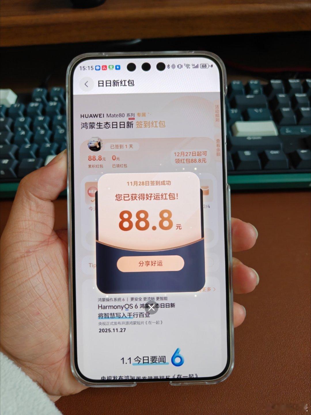 华为Mate80晨曦金版本已售罄抢到手机的朋友教你一招薅华为的羊毛,鸿蒙有礼可以领腾讯视频、华为音乐、视频等等软件会员,日日新签到红包还能领取封顶99.9的随机红包,我今天就领了88.8