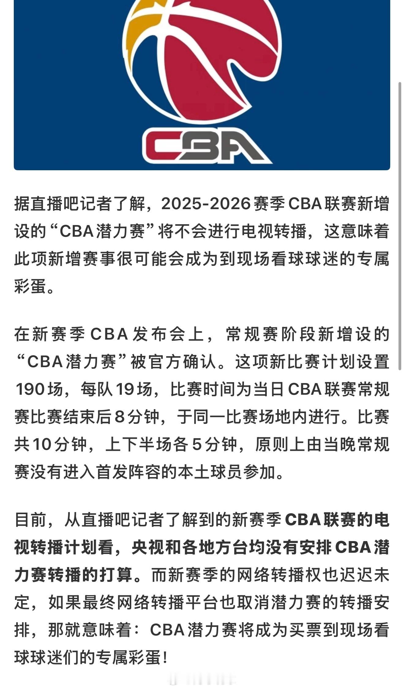 据直播吧报道,“第五节”CBA潜力赛转播方将不进行转播,那么这个CBA潜力赛将会是现场观赛球迷的福利,线上的球迷只能通过现场媒体的视角赛后看了!cba新赛季 新疆男篮 阿才说球 CBA 中国男篮