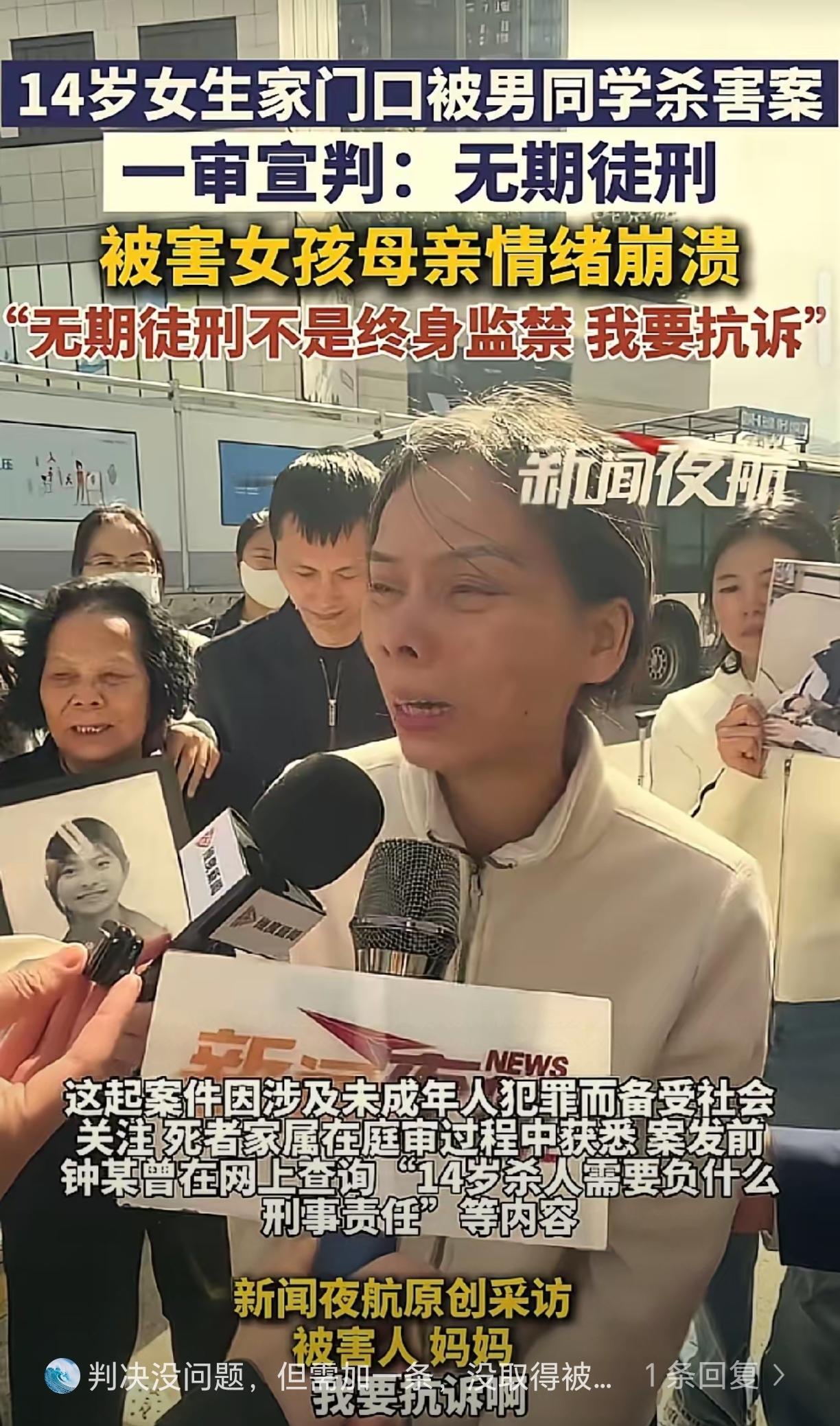 深圳14岁男孩杀害同学案宣判了 优优的妈妈哭诉着说:“十几分钟就宣判了,说他判处无期徒刑,可是无期徒刑不是真正的终身监禁啊!”,甚至他在里面更胖了,我还监管不了他在里面是怎么度过的,​优优妈妈表示她还要抗诉,明明说了用了极其残忍的手段,去伤害未成年人,他就该判处s刑的吗? 而如今的无期徒刑算是从轻处理,就因为他是14岁,未成年,难道优优就不是未成年了吗? 我原谅不了这样的人,优优父母三年无偿接送,他表现的像没事人一样,还会和优优爸爸说“谢谢”,结果反过来,钟某某却因为无端的猜忌s盖优优,下那么重的手,还在网络上搜索相关词条,会受什么处罚,自己父母会不会受影响,提前买好工具等等,这一切就是有预谋的。 优优爸妈一定要等来这份公道,继续上诉,​寻求“公平”,此事大家怎么看呢?