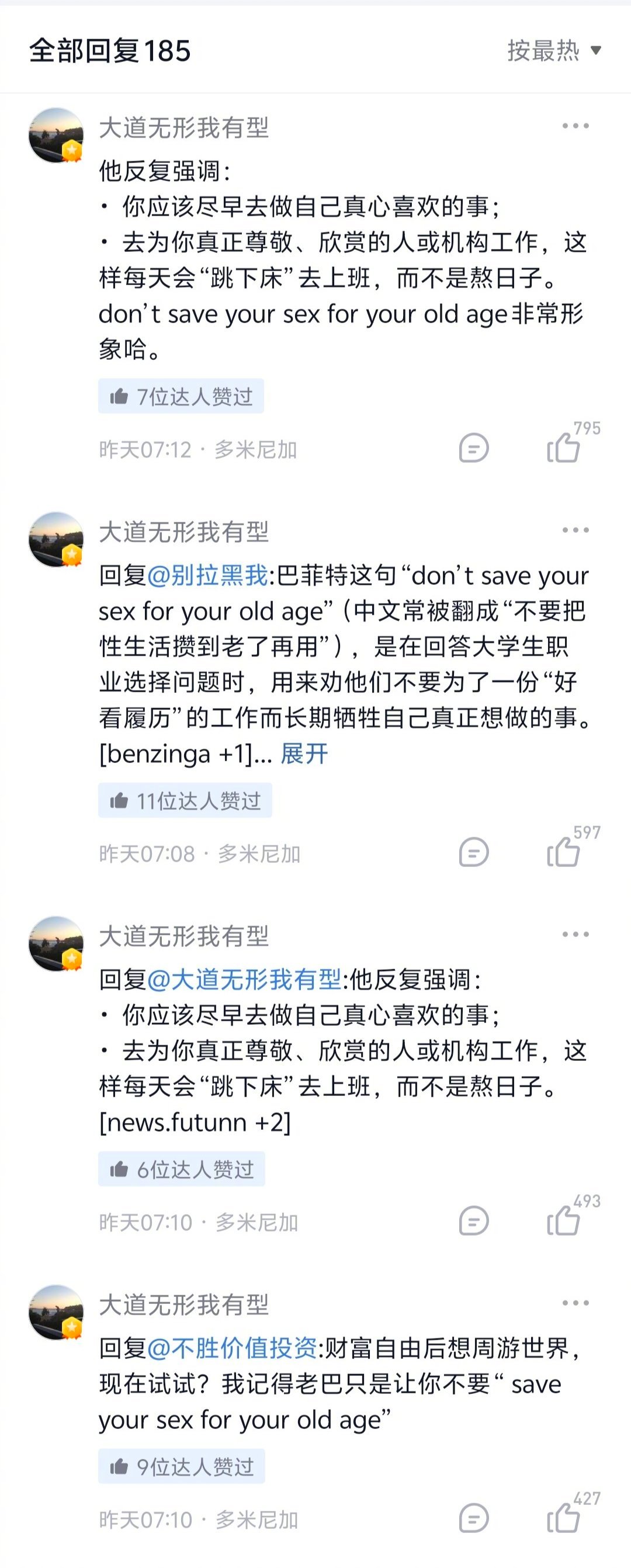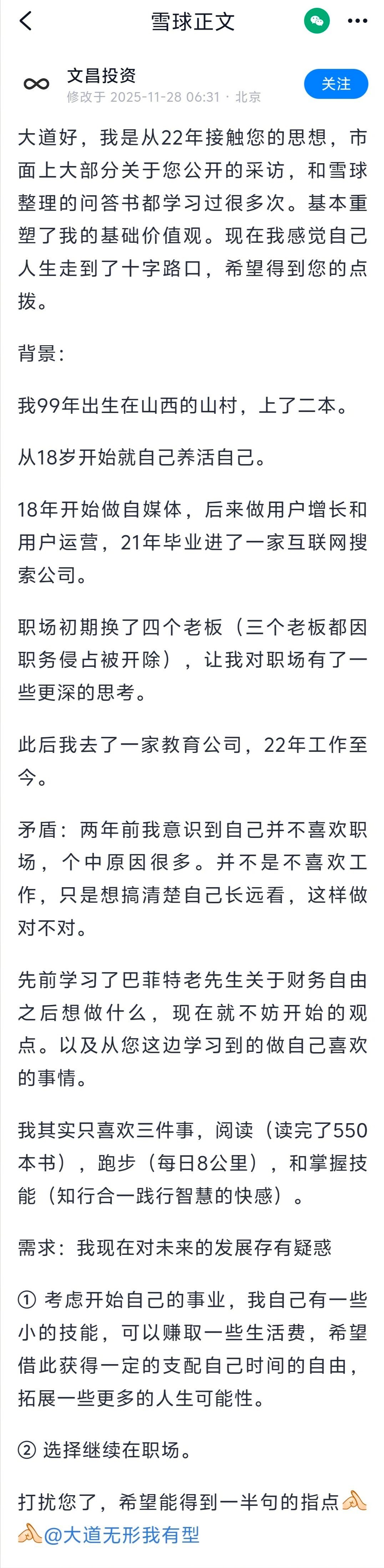 雪球上有个99年出生的小伙子,出生在山西山村,二本毕业,学段永平思想后陷职业迷茫,求段永平指点迷津。段永平回复他:你已经财务自由了?到时候你就明白了哈。同时,段永平在回复网友时说到,尽早去做自己内心喜欢做的事。