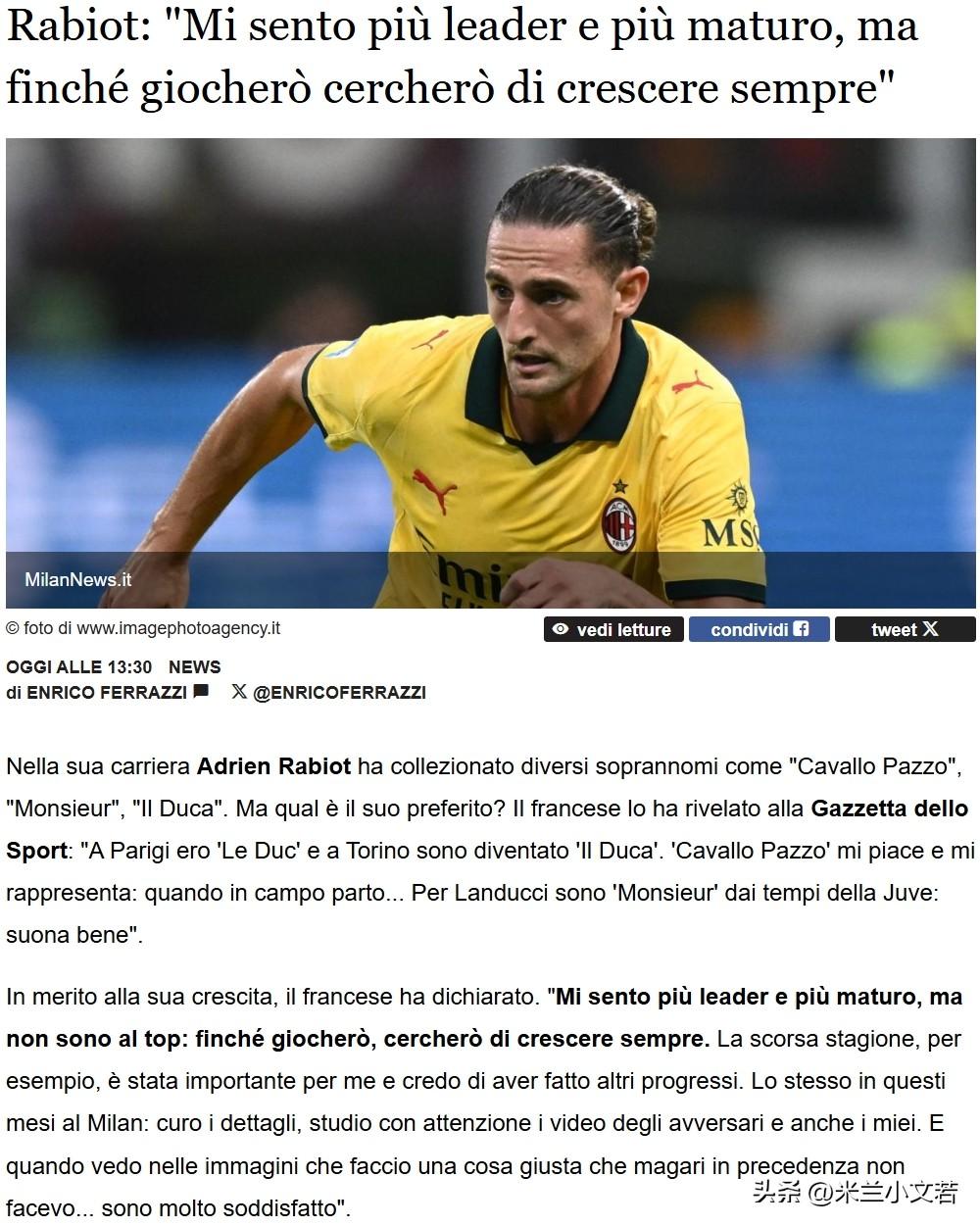 我认为我可以成为米兰的领袖!拉比奥特接受采访表示我满意在米兰的表现,除了没有取得进球,剩下的都是我所期待的,我依然在成长,再次与阿莱格里合作我认为我成熟了很多,但依然没有达到预期的巅峰,我认为我可以成为米兰的领袖。个人意见既然都谈到领袖了就别那么谦虚,直接说我想当米兰领袖,迈尼昂不续约我就教育他,国家队比赛我就各种回传。 在米兰的这几个月里,我也在努力关注细节,仔细研究对手和自己的比赛录像,当我看到录像中自己做了一些以前不会做的事情时,我会很高兴。个人觉得拉比奥特现在就是球队的领袖,你不在莫德里奇是真的带不动中场,莫德里奇是核心,但他年龄大了,很多时候都会力不从心,而你确实是巅峰之年。 令人刮目相看的拉比奥特,他在米兰的表现说他是米兰核心相信没有人会反对,没有拉比奥特的米兰阵容真的不能看,无论踢谁防守都让人觉得提心吊胆。