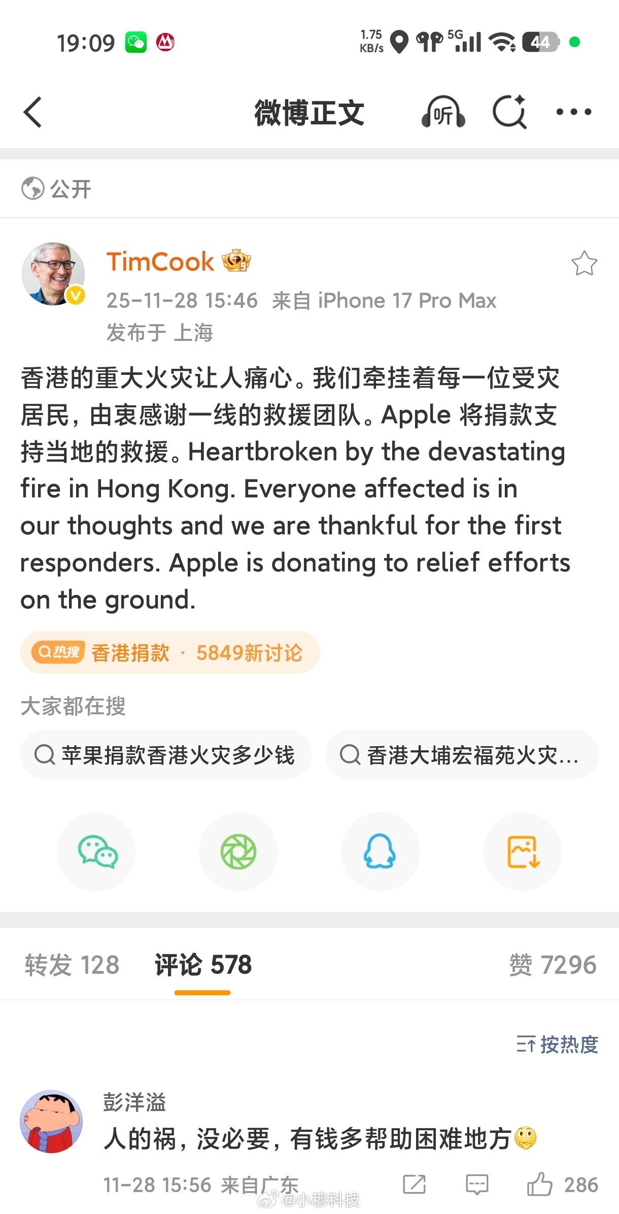 苹果向香港捐款库克宣布苹果给香港火灾捐款,网友觉得没必要……
