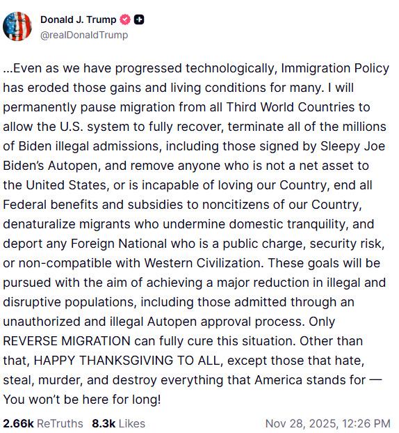 特朗普最近在社交媒体上扔下了一颗重磅炸弹。他宣布要永久停止接受来自所有"第三世界国家"的移民,还要驱逐那些被他认为与西方文明"不相容"的外国人。 这话说得挺重。特朗普解释说,这么做是为了让美国的体系"完全恢复"。他特别提到要取消拜登政府时期给数百万非法入境者发放的合法身份,还不忘给拜登起了个外号叫"瞌睡乔"。 具体措施相当严厉。他打算停止向非美国公民发放所有联邦福利和补贴,包括住房和医疗这些基本保障。更厉害的是,他还要撤销那些"破坏国内安宁"的移民的公民身份,把依赖公共救济、构成安全威胁的外国人都赶出去。 特朗普对这些移民的评价很难听。他说美国现有的5300万外来人口中,"多数依赖福利生活",还声称他们来自"失败国家、监狱、精神病院或犯罪集团"。 这事儿的导火索是一起枪击事件。11月26日,两名国民警卫队员在白宫附近几个街区遭到枪击,一死一重伤。嫌疑人是个阿富汗移民,2021年通过拜登政府的"盟友欢迎行动"计划来到美国。 特朗普抓住这个机会大做文章。他把袭击定性为"恐怖行为",要求重新审查拜登任内所有通过该计划入境的阿富汗移民,大约有7.6万人。国土安全部长诺姆也帮腔,说嫌疑犯属于"未经筛查、大批涌入人员"。 行动已经开始了。美国公民及移民服务局宣布要对来自19个"受关注国家"的绿卡持有者进行全面重新审查。根据6月的总统公告,阿富汗、缅甸、乍得等12个国家的公民被全面限制入境,布隆迪、古巴等7个国家受到部分限制。 枪击案后,特朗普还紧急向华盛顿特区增派了500名国民警卫队员。这个地区原本就有超过2000名驻军。 不过这些政策存在不少模糊地带。比如什么叫"第三世界国家"?怎样才算"与西方文明不相容"?这些都没有明确标准,也没有具体时间表。 特别引人注意的是,特朗普把矛头主要对准了阿富汗移民。他要求彻查所有从阿富汗入境的人,这引发了对特定族裔针对性打压的争议。 白宫方面倒是全力支持。他们在转发特朗普的帖文时特别强调,这是"特朗普发布的最重要信息之一,需要逐字阅读"。看来,这项政策已经获得了官方高层的背书。 这场移民政策的大转向,注定要在美国国内和国际社会掀起不小的波澜。