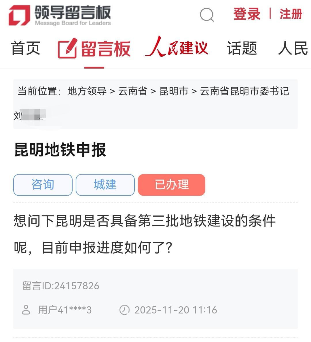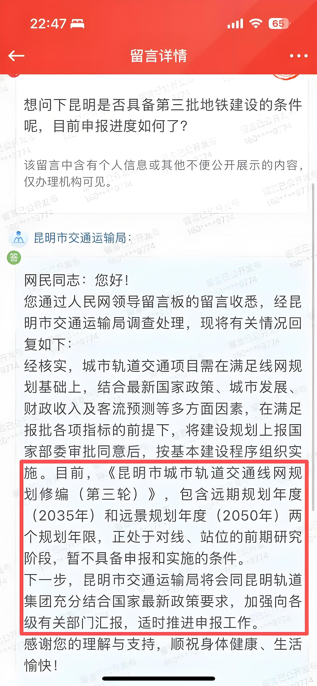 11月20日昆明网民向昆明市委书记留言咨询: 🚉昆明地铁申报 想了解一下,昆明是否具备第三批地铁建设的条件,目前申报进展如何了? 🚊11月27日,昆明市交通运输局官方作出回复 网民同志:您好! 您在人民网领导留言板的留言已收悉。经昆明市交通运输局调查处理,现将有关情况回复如下: 经核实,城市轨道交通项目需在符合线网规划的基础上,综合考量最新国家政策、城市发展、财政收入以及客流预测等多方面因素。在各项报批指标均达标的情况下,将建设规划上报国家部委,待审批通过后,按基本建设程序组织实施。 目前,《昆明市城市轨道交通线网规划修编(第三轮)》涵盖远期规划年度(2035年)和远景规划年度(2050年)两个规划年限,正处于线路和站位的前期研究阶段,暂不具备申报和实施条件。 下一步,昆明市交通运输局将联合昆明轨道集团,充分契合国家最新政策要求,加强向各级有关部门汇报,适时推进申报工作。 感谢您的理解与支持,祝您身体健康、生活愉快! 地铁