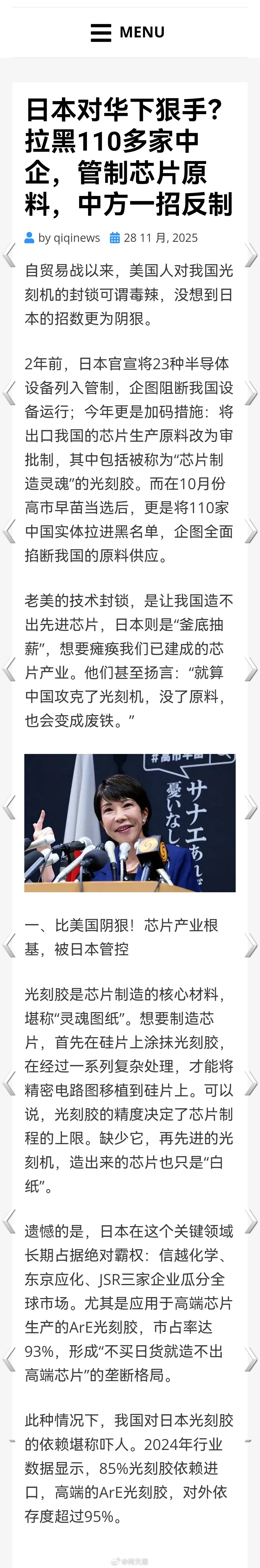 日本对华下狠手?拉黑110多家中企,管制芯片原料,中方一招反制。海外新鲜事何天恩 台政客与高市早苗办公桌合影被群嘲