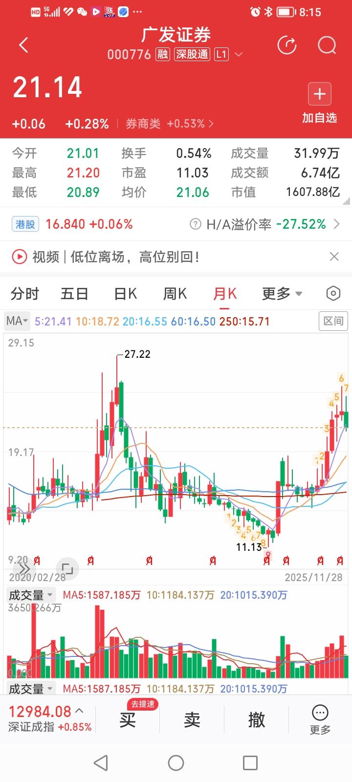 中信证券明年有戏吗?可以大胆预测下,中信证券明年戏比今年大。为什么这么说呢? 中信证券去年的高点是36.49元,今年的高点是32.53元,今年的高点比去年低了12%,而且今年的最大涨幅仅11.5%,整体涨幅截止今天是—5.4%。也就是说今年对中信证券来说是涨幅负年或者小年。 因为中信证券今年涨幅太拉胯,散户交易习惯是追涨杀跌,而机构则是理性分析,人弃我取,业绩驱动,所以散户抛出去的筹码大概率被机构接走了。 广发证券去年是涨幅小年,今年最大涨幅52%,截止今天整体涨幅30.4%,广发证券今年是妥妥的涨幅大年。风水轮流转,不排除实力雄厚、业绩优秀、估值偏低、无人问津的中信证券明年是涨幅大年。