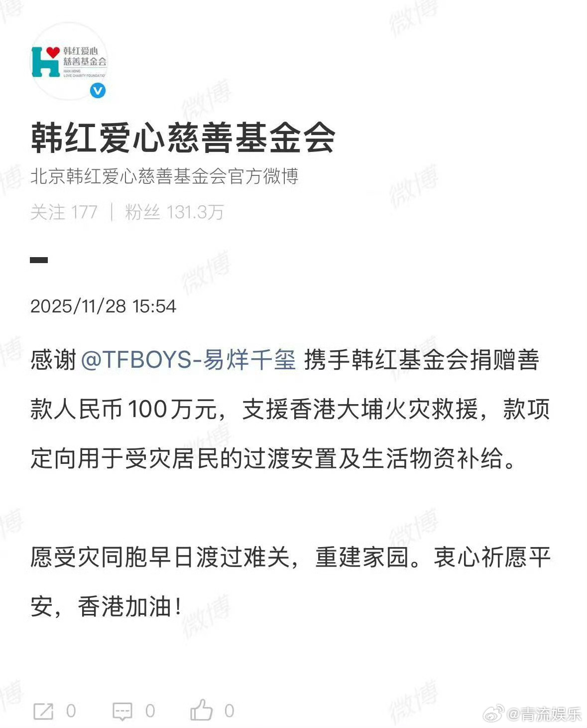 易烊千玺向香港捐款100万据:感谢 携手韩红基金会捐赠善款人民币100万元,支援香港大埔火灾救援,款项定向用于受灾居民的过渡安置及生活物资补给,愿受灾同胞早日渡过难关,重建家园。